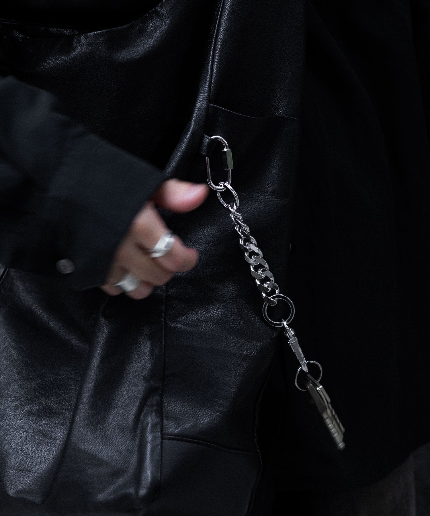 オブジェクトのオリジナルカラビナを使用しておりブランドのシグネチャーアイテムでもあります。追加でカニクランプ型のエンドパーツが反対側についており、どちらも留め具として使用可能です。