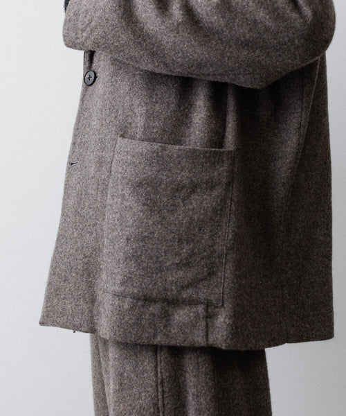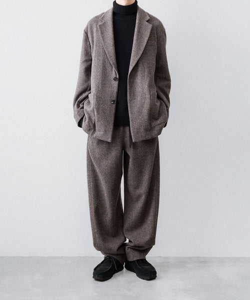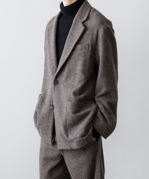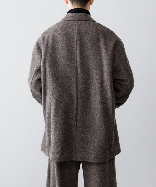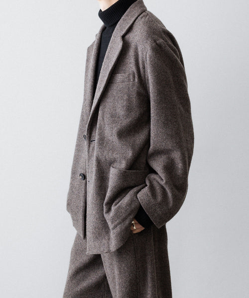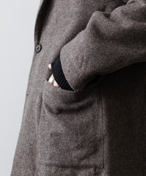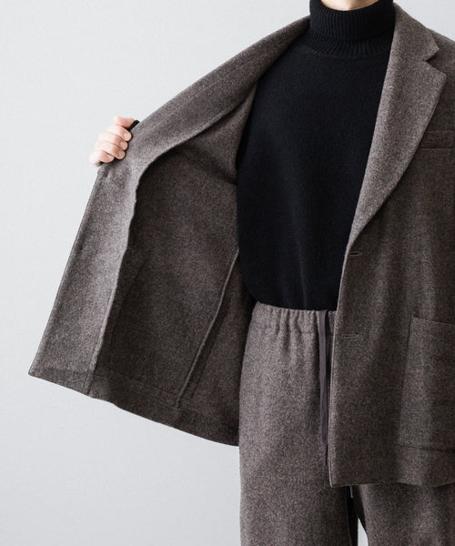 カシミヤの美しい表情とウール特有の膨らみ、弾力性を備えた暖かく優しい風合いが特徴のウールカシミヤフリースで製作した一重のイージー仕様のジャケット。非常に軽く柔らかい着心地が魅力。ジャケットの印象が残るよう肩周りの仕様、ラペル、着丈、袖丈を設定。
