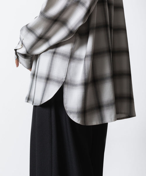 レーヨン素材のショート丈のオンブレ・チェックのスカーフシャツです。丈が短めなので裾をアウトにしてブルゾンライクに羽織る事ができます。