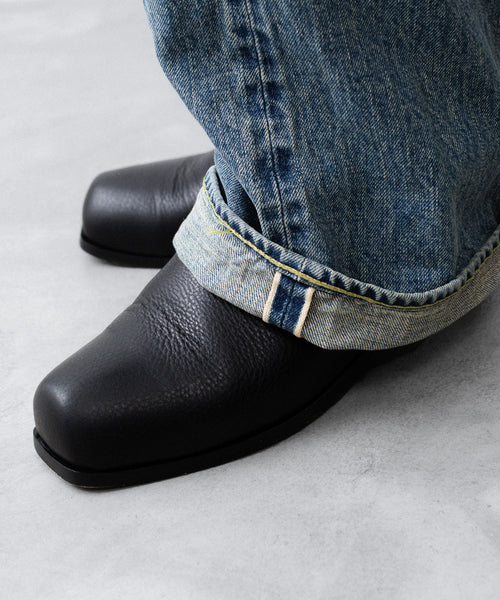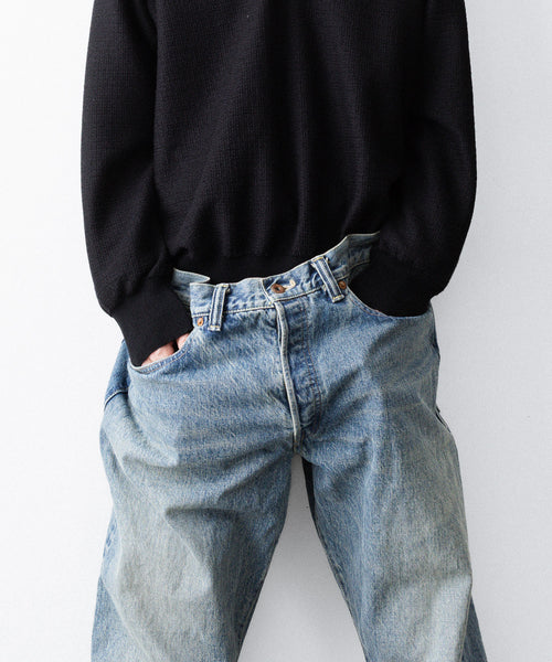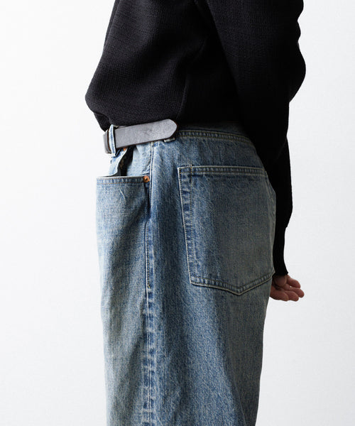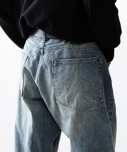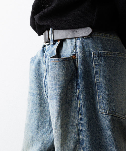 ヴィンテージの名作・大戦ジーンズをモチーフに、ハイパービッグサイズで再構築した一本。大戦モデルのフォルムを踏襲しつつ、ウエストはベルトで絞る前提のワイドシルエットに。丈はロールアップや裾上げを想定した⻑めの設定。体型を問わず、たっぷりとしたシルエットで着用できるデザインです。生地はヘビーオンスの生機デニムを使用。前立ては鉄製の月桂樹ボタンとドーナツボタンによるボタンフライ。隠しリベット付きのバックポケットやイエロー系のステッチ、アソートのスレキなど、時代考証に基づくディテールを盛り込んでいます。