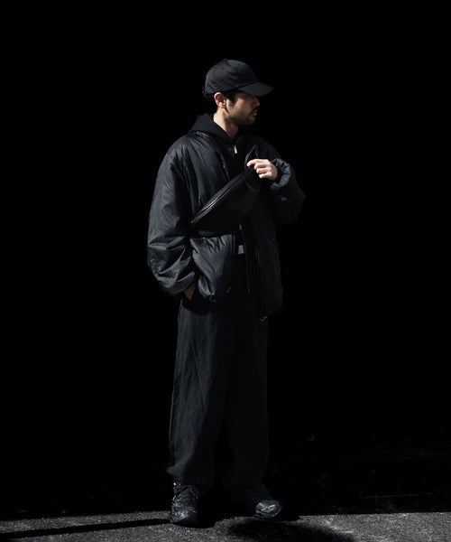 洗い加工を入れコシを抜かした後、撥水加工を施すことで生まれる表面感、適度なハリ感が特徴のリネン×ナイロンの交織素材で製作したトラックパンツ。 スポンジライクなナイロン糸とハリの強いリネンを交織したことによる独特なぬめりのある生地感も特徴。両脇部分には曲線のはぎ、極細のパイピングが入る。ピスポケットは両玉縁仕様。 左ポケット部分にUMBROのロゴが入る。
