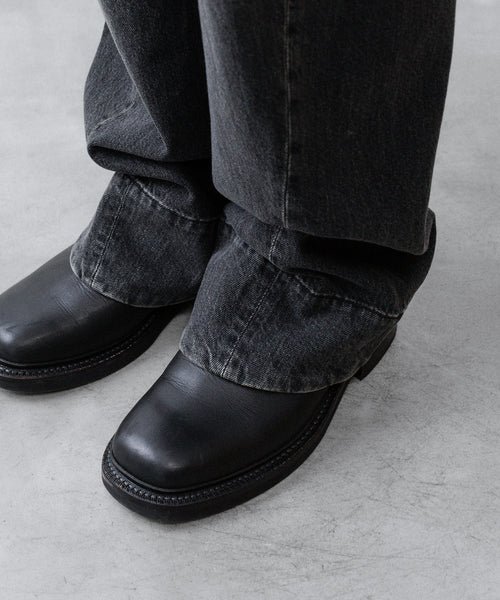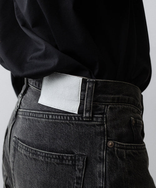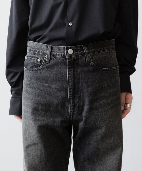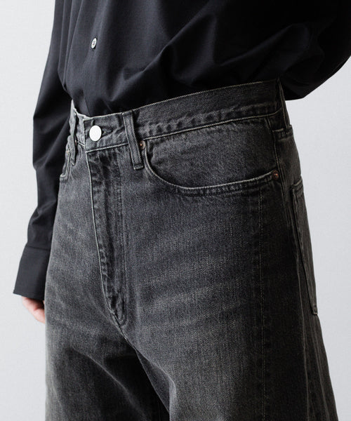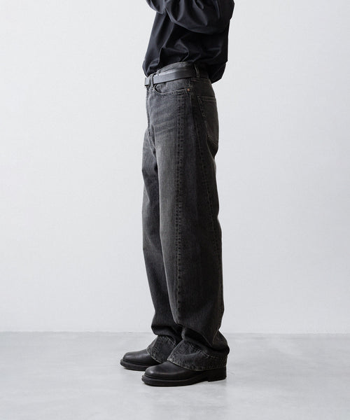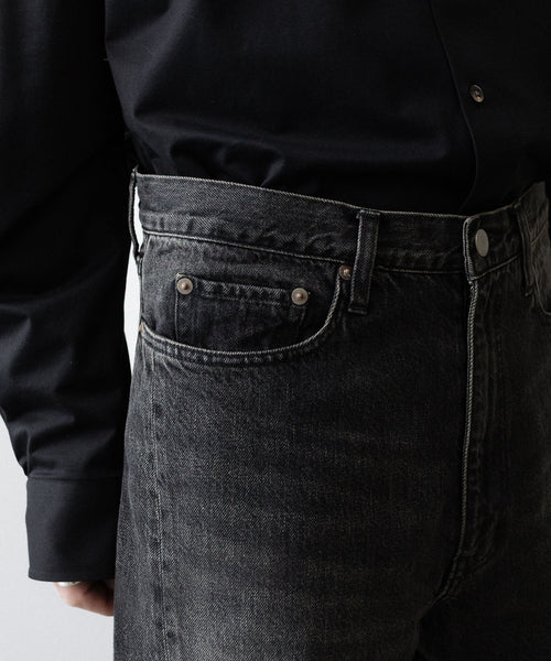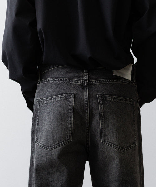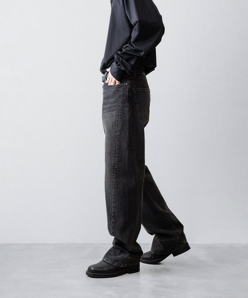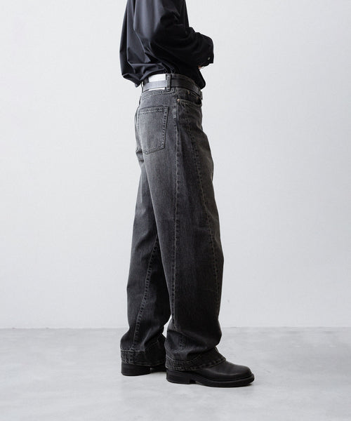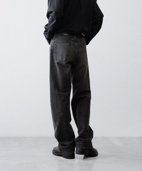 膝周りのツイストがかったシルエット、裾部分のたまり方が特徴のツイストカットデニム。 両脇、内側はぎ部分をツイスト気味にパターンを設定し、膝周りにニュアンスを出している。裾部分は前後差、左右差をつけ独特のたまり感に設定している。 ストーンウォッシュ、ブリーチ、オーバーダイ、吹付け、手作業によるダメージ感等様々な加工過程を施し奥行きのあるデニムの表情を出している。