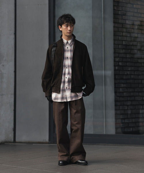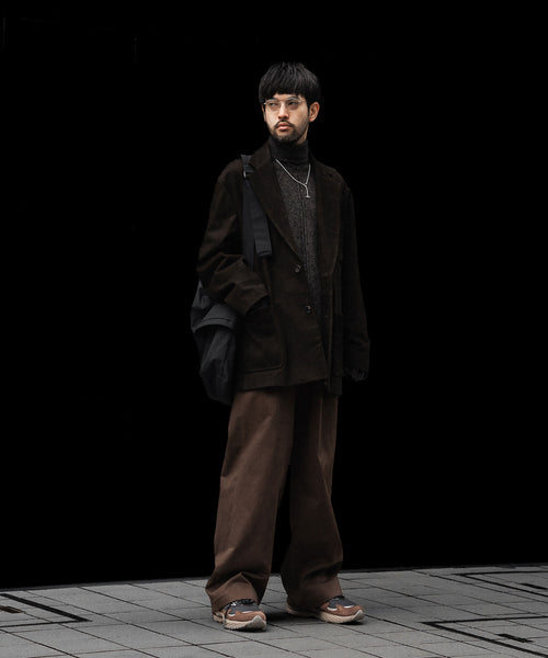 16×10の肉厚チノを微起毛して仕上げた素材を使用したワンタックワイドパンツ。 深めの股上、すっきりめに設定したウエスト周りのバランスがエレガントな印象のワイドストレ ートシルエット。 硫化+微起毛により、洗い込むごとにスエードのような風合いになるのも特徴。