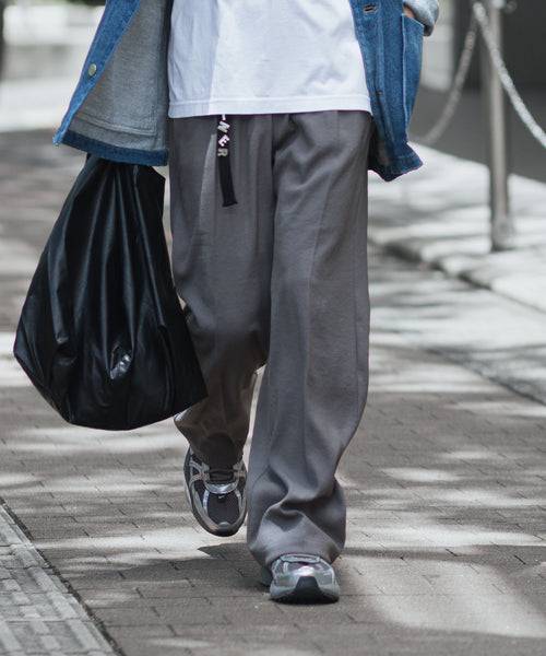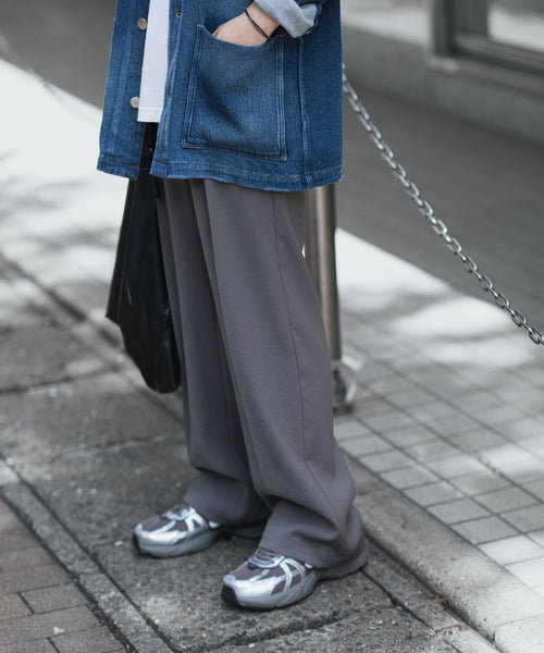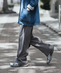 通常、外向きに入るタックを内側に向けることで、ワイドながら横への広がりを抑えすっきりとした表情に。