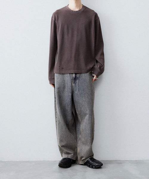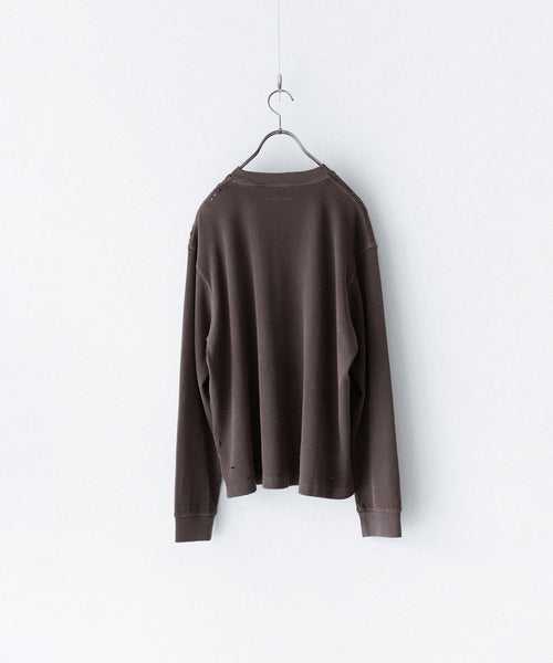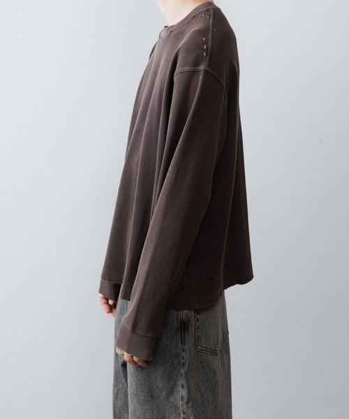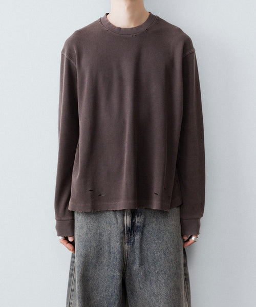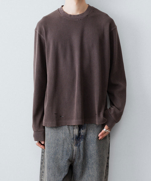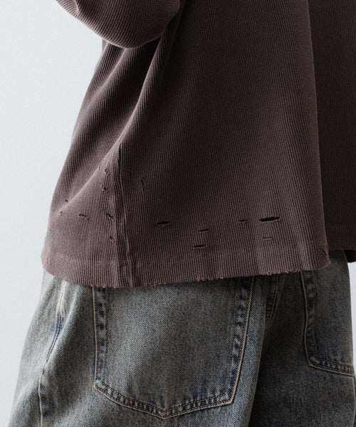 ダメージ加工が施されたワッフル素材のロングスリーブTEE。