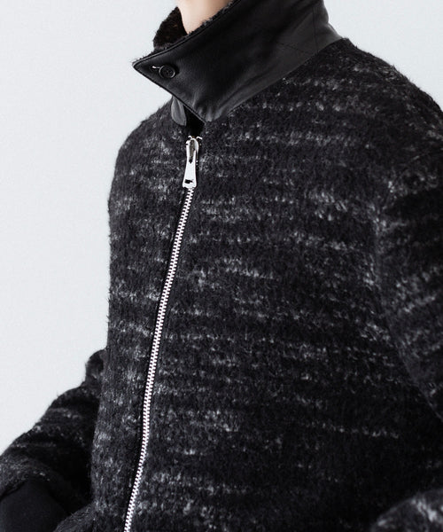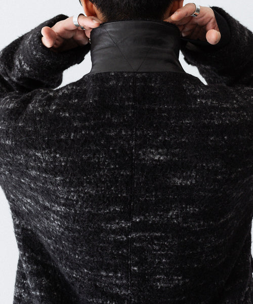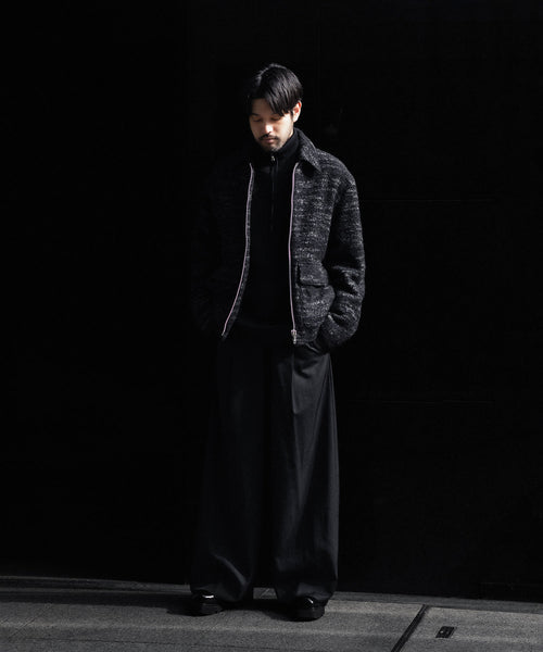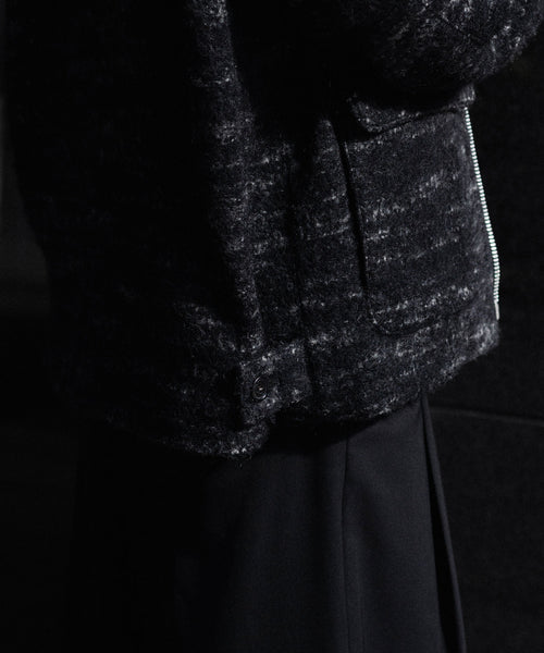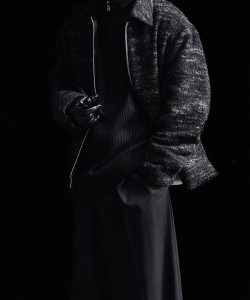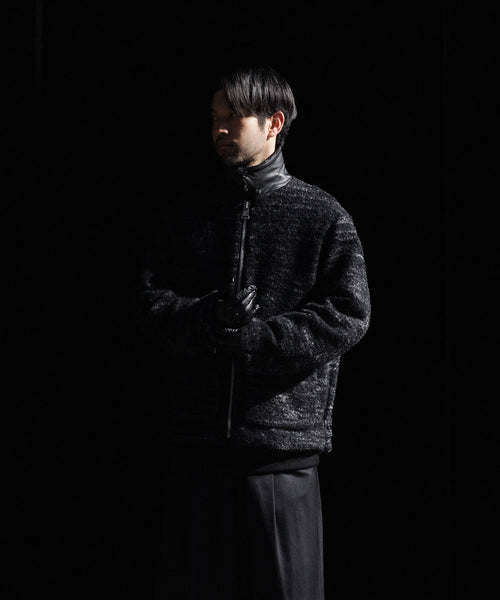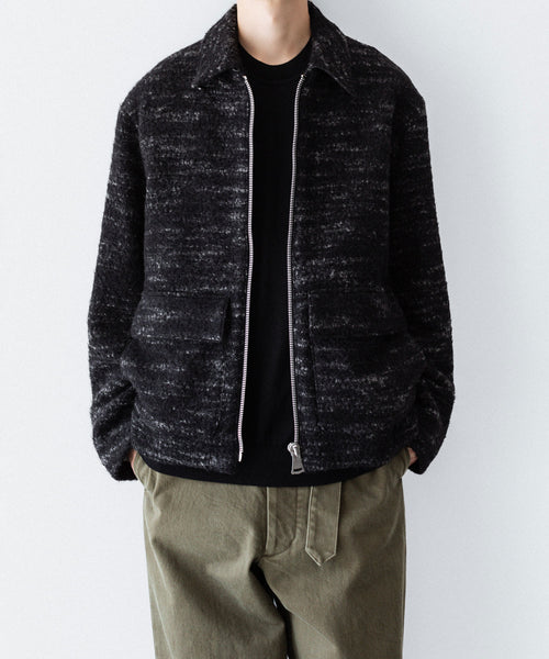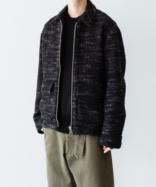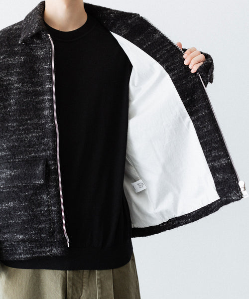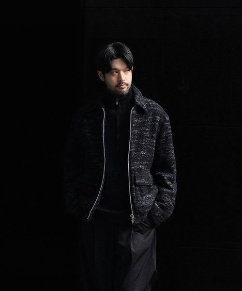 1950年代のアメリカ製ヴィンテージに見られるスポーツジャケットをベース にしたBIGポケット付きのZIPジャケット。インテリムでは珍しいWALDESのファスナーを採用。当時の引き手を忠実に復刻した大振りのモデルを用い、 ファスナーの務⻭を見せることでデザインのアクセントにしました。フラッ プ付きのパッチポケットはアウトドアの名品などにも採用されているハンドウォームのギミックを踏襲。衿を立てた状態でも着用できるよう、衿先にボタンを付けています。 衿裏とフラップ裏には、タンナーに直接交渉の上別注したベジタブルタンニ ンのシープスキンを表地のカラーに合わせて配しました。裏地には某メゾンも多くのアイテムに使用する国産のコットンツイル生地を採用し、カジュア ルなムードを持たせています。また本水牛ボタンの産地と直接交渉のうえ オーダーした本水牛ボタンを使用しています。