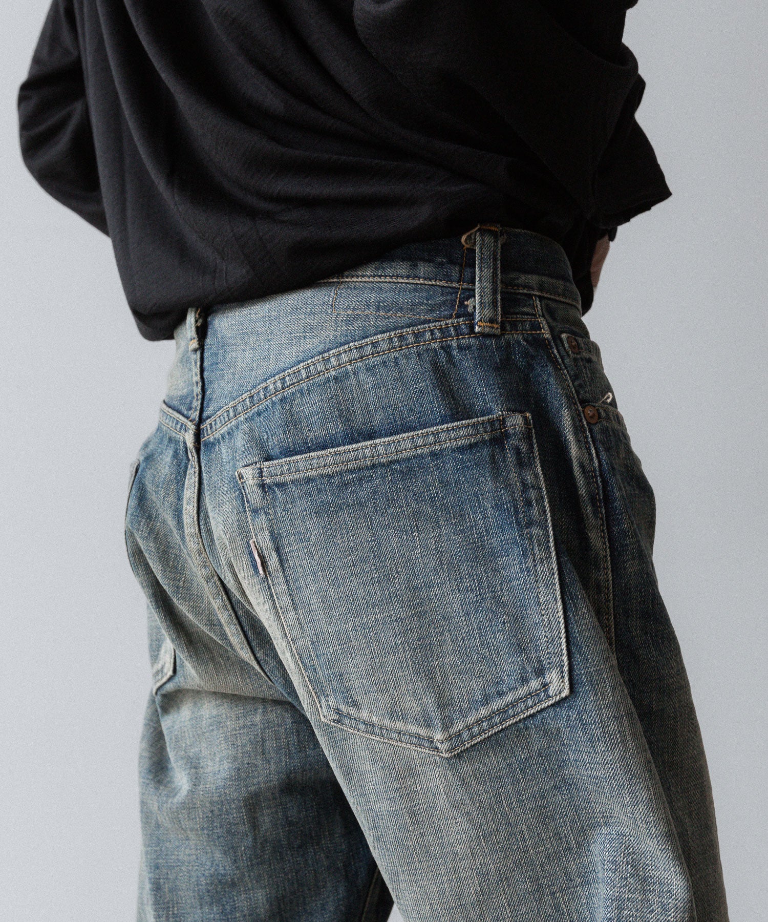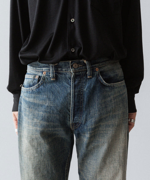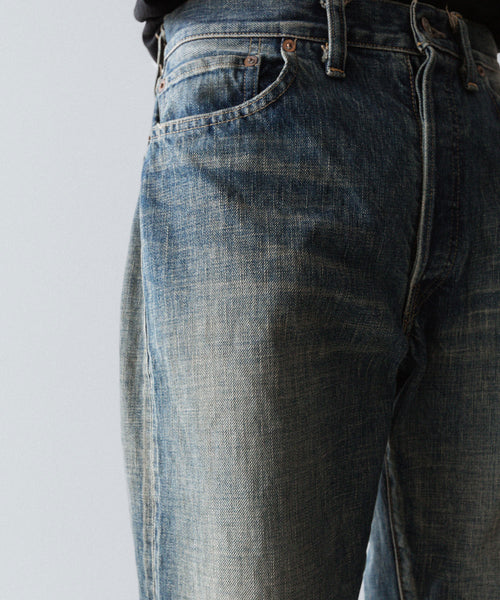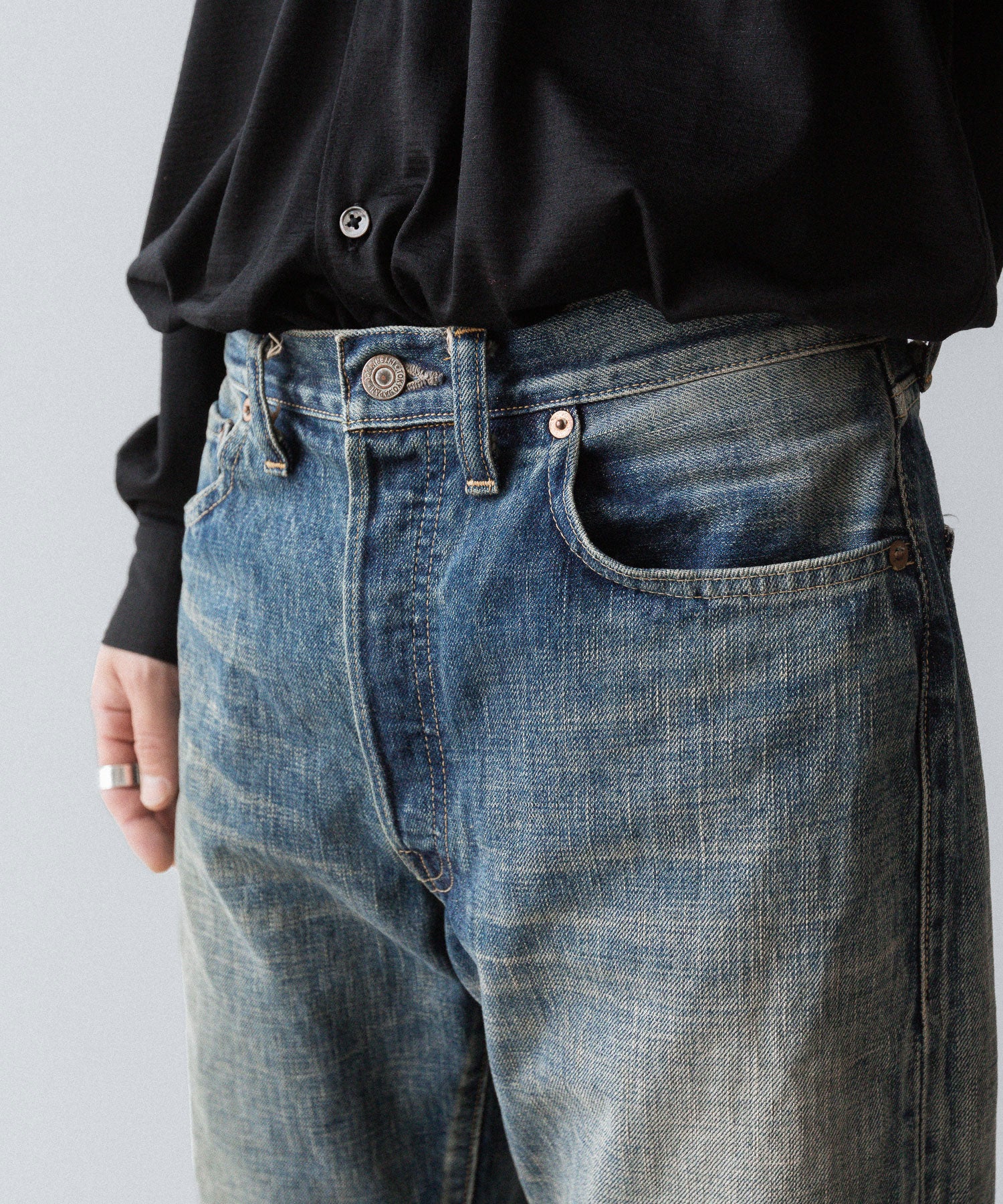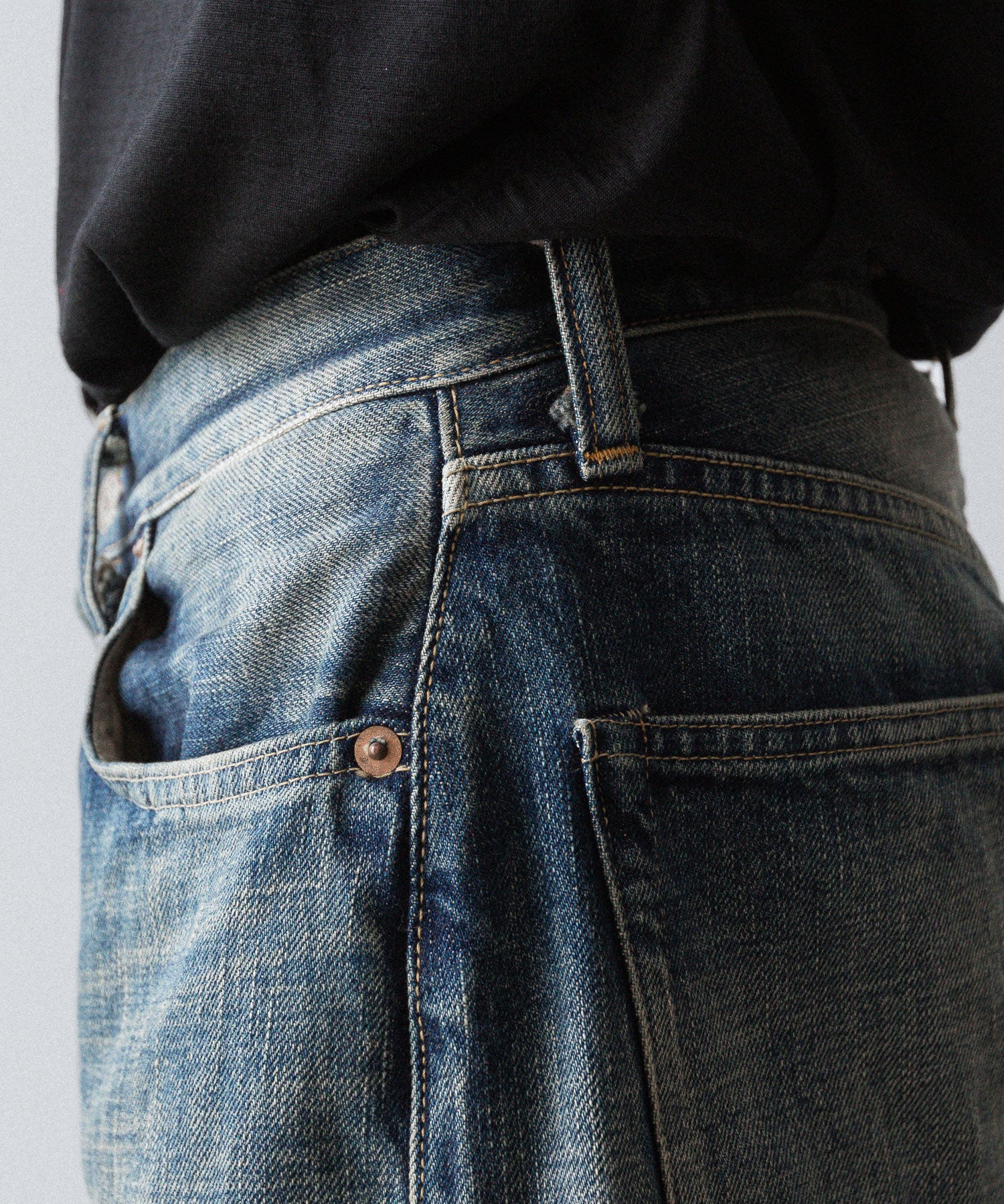「501の完成形と評価されている」、実際の1947年のXX をモチーフに製作したジーンズ。当時はジーンズがワークウエアからファッションアイテムとして認知されつつあっ たタイミングで、47XXは体型を選ばない洗練されたフォルムのモデルとしてヴィンテージ市場でも特に貴重とされています。 極めて貴重なヴィンテージからフォルムをトレースし、 しっかりと深さのある股上や、ゆるやかにテーパード感のあるストレートシルエットを再現しました。 仕様もヴィンテージにならい、ポケット脇の通所“クインチ”ステッチを⻑くした他、ベルトループも太めの山高仕様に。ピスネームも今回のためにレーヨン製の片面タブを製作しました。前立てには鉄製のオリジナルロゴ入りボタンに特殊メッキ加工を施したものを採用しています。