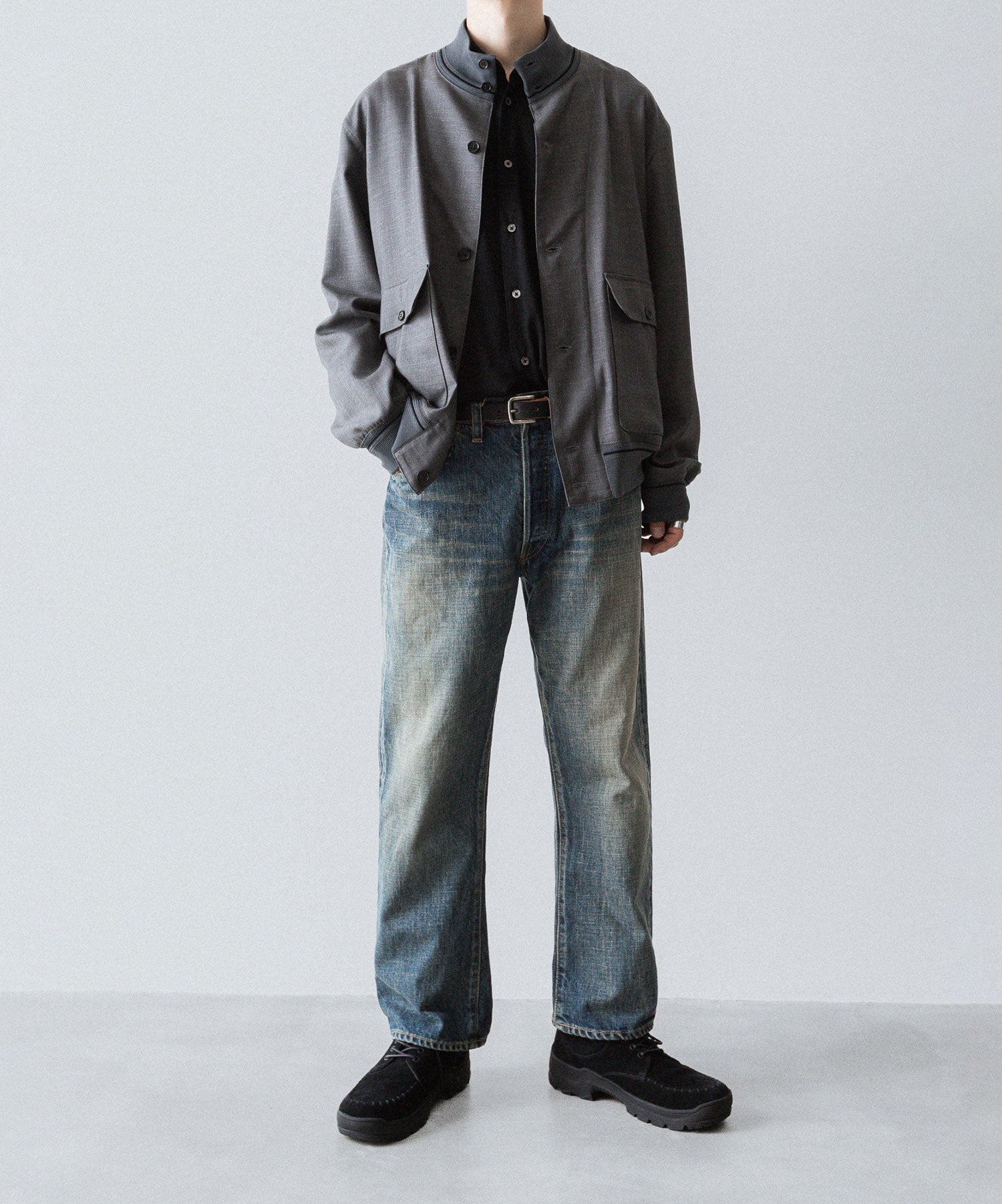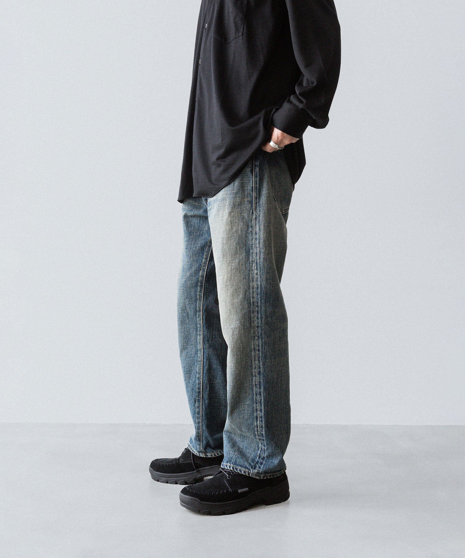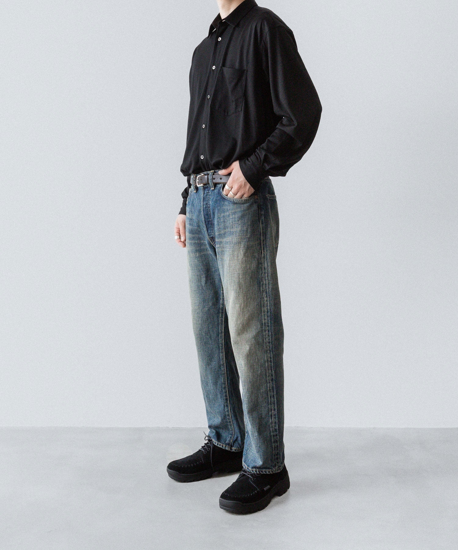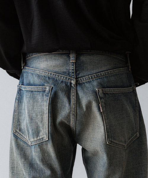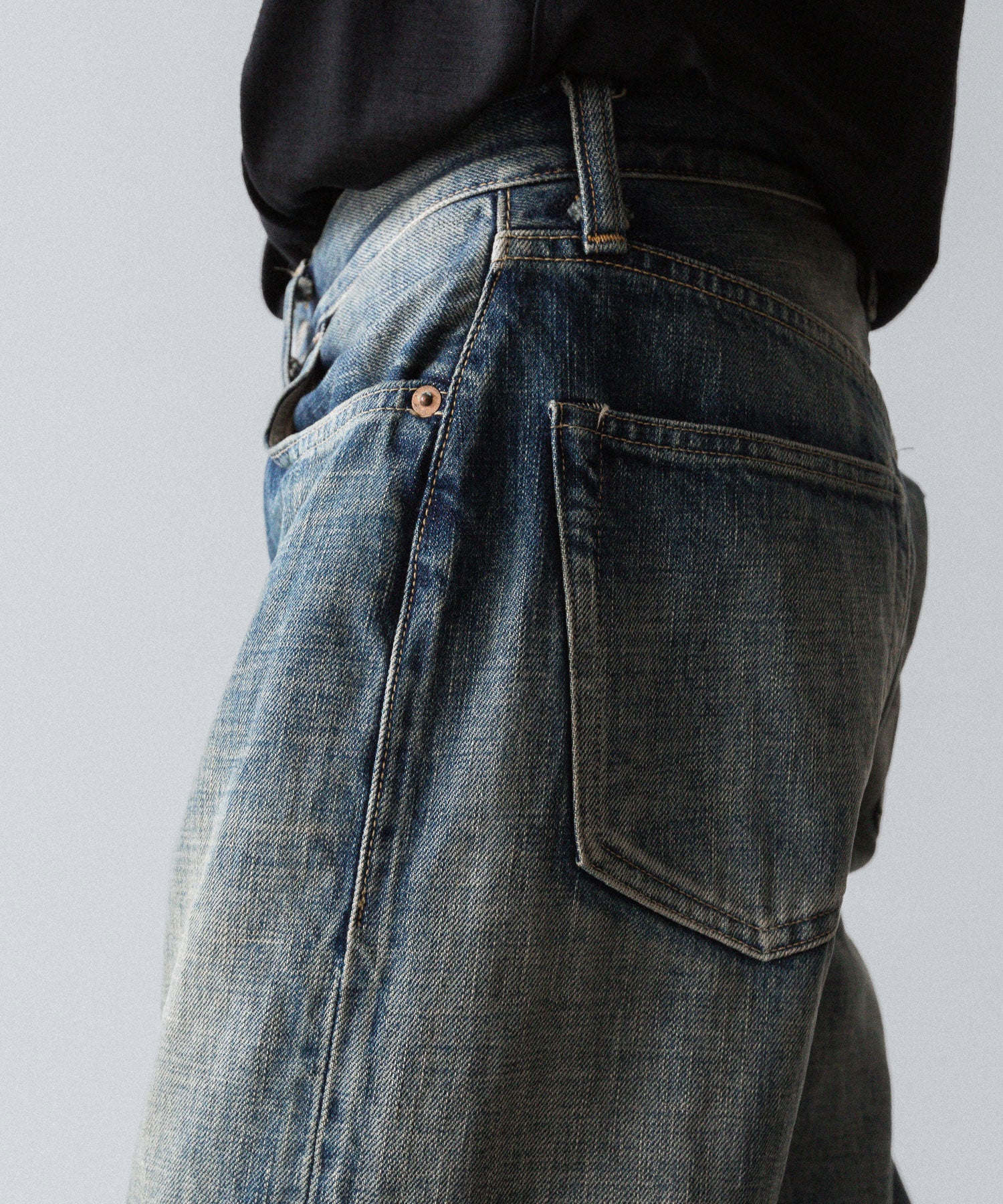 「501の完成形と評価されている」、実際の1947年のXX をモチーフに製作したジーンズ。当時はジーンズがワークウエアからファッションアイテムとして認知されつつあっ たタイミングで、47XXは体型を選ばない洗練されたフォルムのモデルとしてヴィンテージ市場でも特に貴重とされています。 極めて貴重なヴィンテージからフォルムをトレースし、 しっかりと深さのある股上や、ゆるやかにテーパード感のあるストレートシルエットを再現しました。 仕様もヴィンテージにならい、ポケット脇の通所“クインチ”ステッチを⻑くした他、ベルトループも太めの山高仕様に。ピスネームも今回のためにレーヨン製の片面タブを製作しました。前立てには鉄製のオリジナルロゴ入りボタンに特殊メッキ加工を施したものを採用しています。