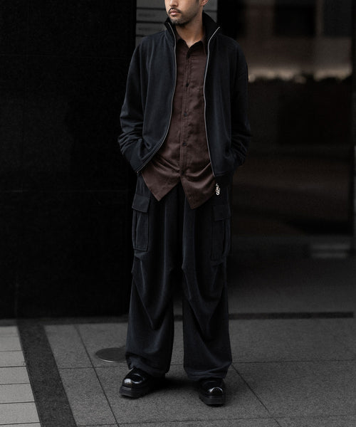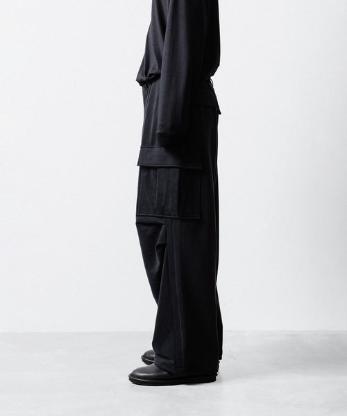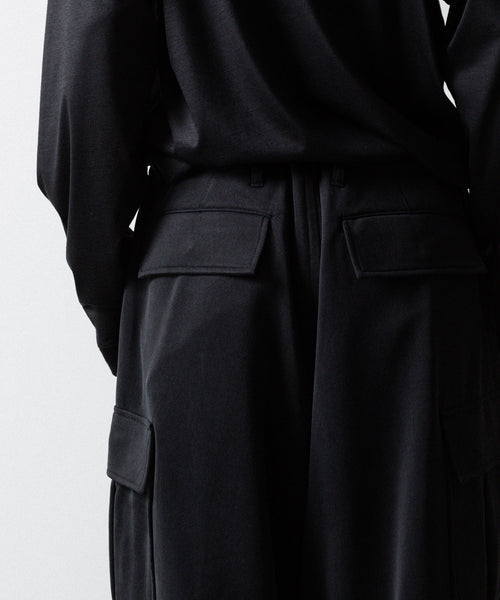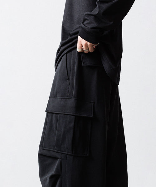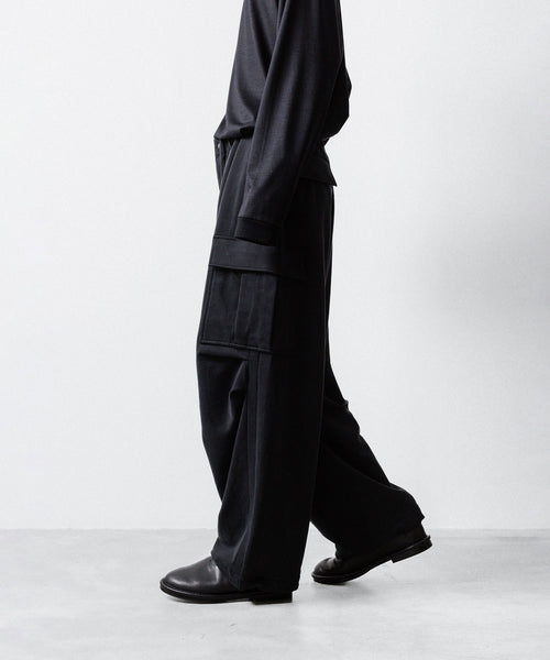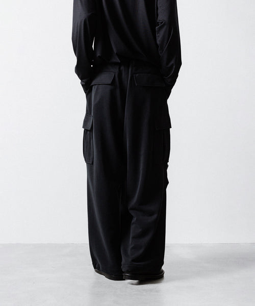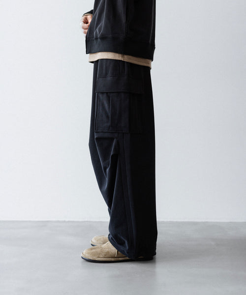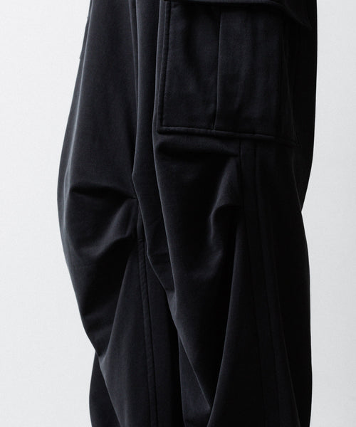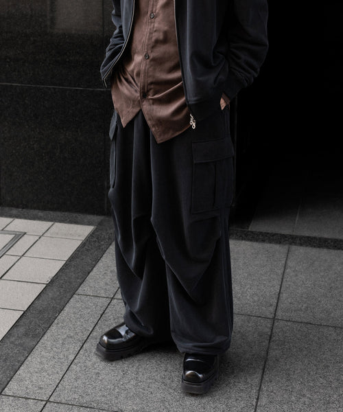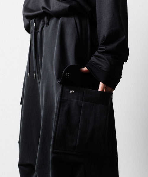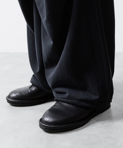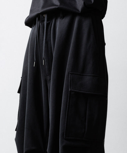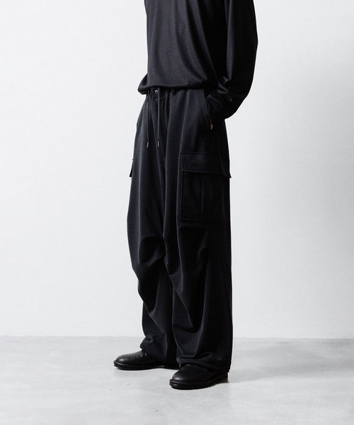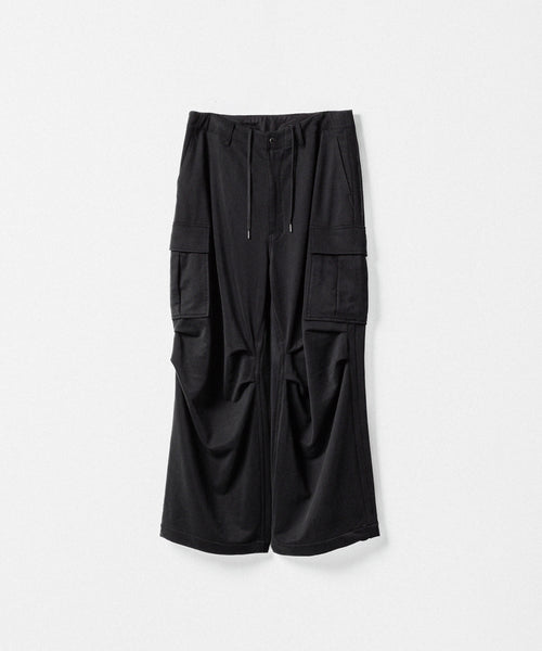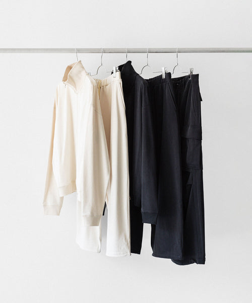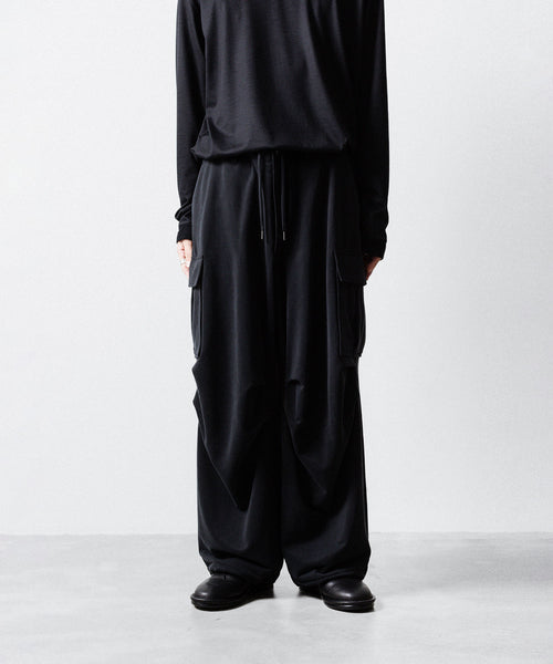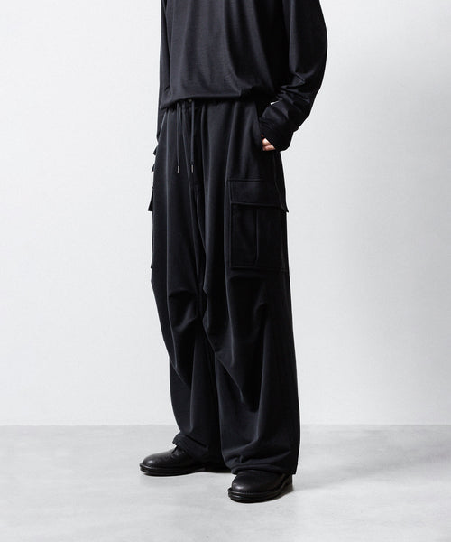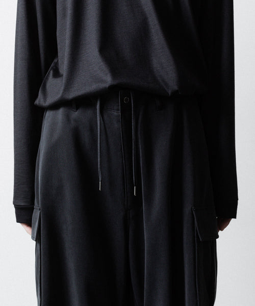 裾にドローコードを入れているので絞ることも可能です。 ウエスト、裾を絞って着用頂いた時の生地のギャザーはテキスタイルの良さが全面にわかるパンツです。
