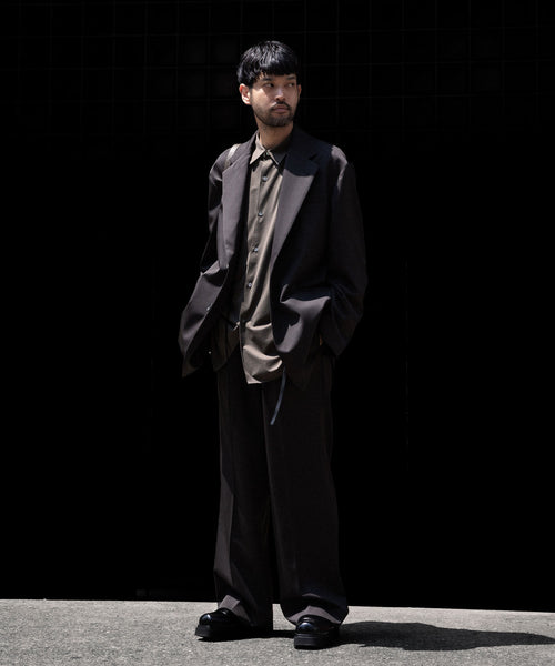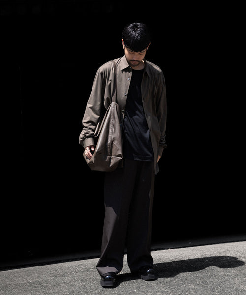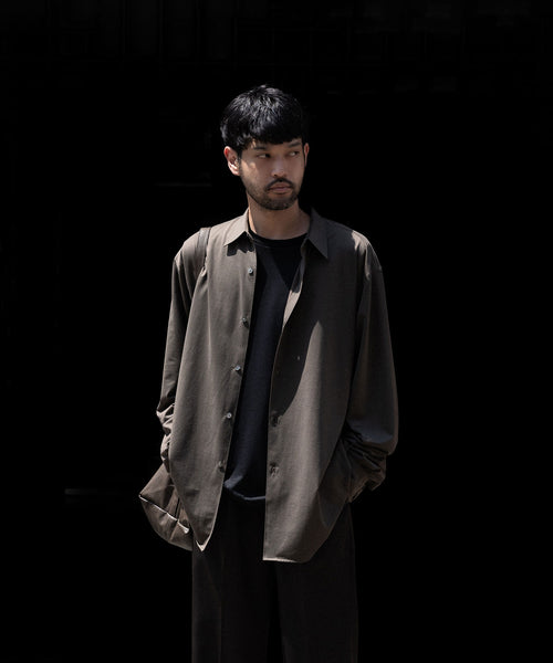 ディティールは、ドレスシャツを採用し全て巻き伏せ本縫い仕様、貝蝶釦使いです。素材のハリ感、光沢感、そして塩梅の良いシルエット、生地が生み出すドレッシー感とパターンを融合させた、唯一無二のシャツ。 袖のギャザーなどよりドレスなディティールに仕上げています。