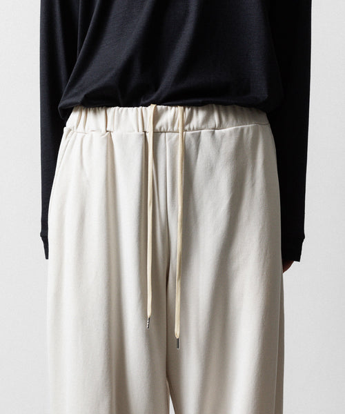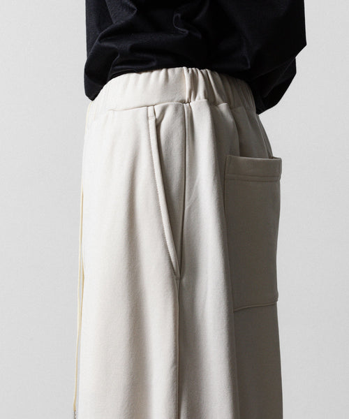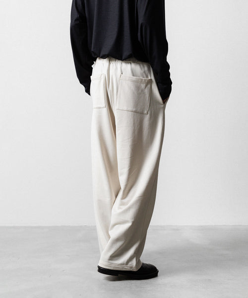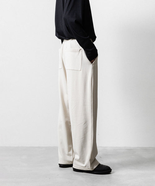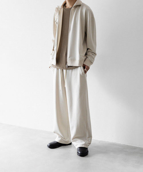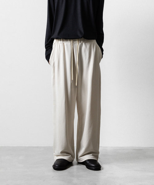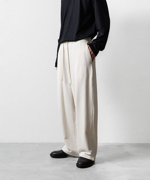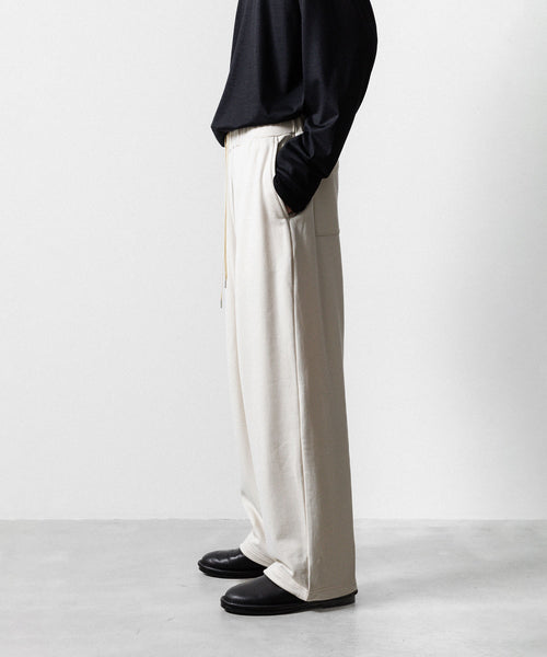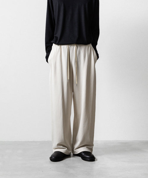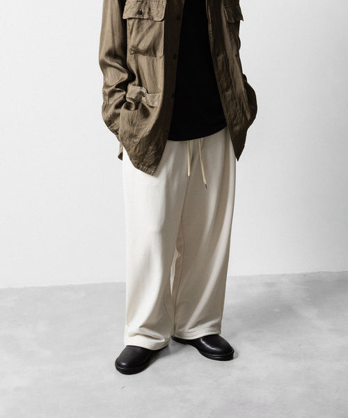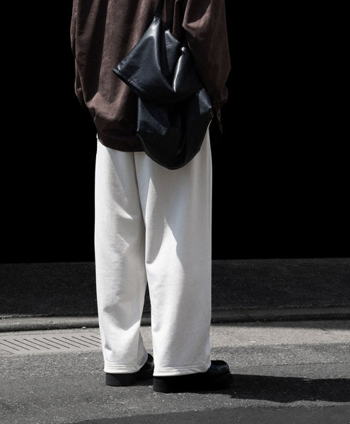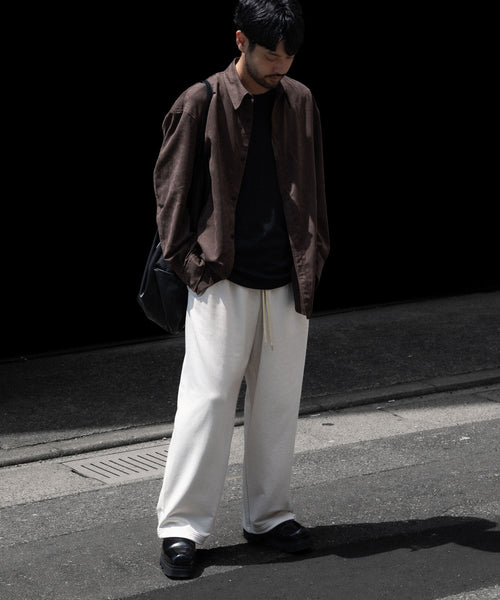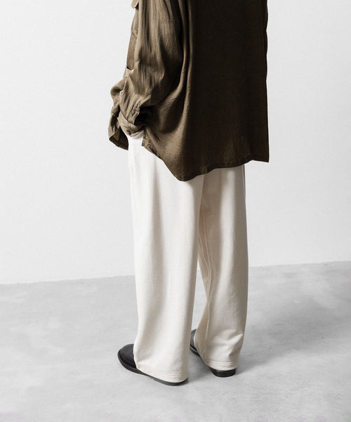 ワタリからストンと落としたストレートシルエットのワイドパンツ。 裾にドローコードを入れることで様々なシルエットで着用頂けます。 ウエストや裾を絞った際の生地のたまりなどが綺麗に出るように素材を最大限に活かしたディティールです。