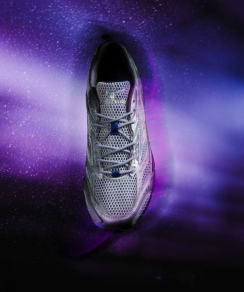 アッパーには、巧みに配色された2トーンのオープンメッシュと、光沢感があり宇宙の輝きを表現したTPUオーバーレイを組み合わせたデザインが特徴で、特殊技術で加工したメタリックディテールや、夜空のグラデーションを表現したプリントインソールが採用されています。