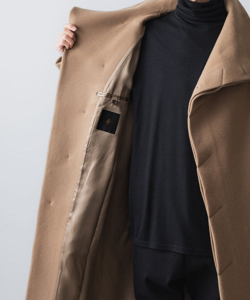 前身の襟にハギ目のない独特のパターンを採用した立ち襟コート。
