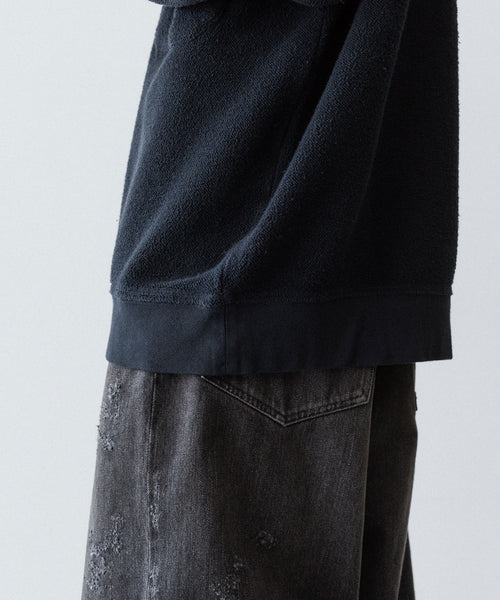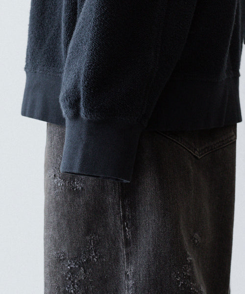 裏毛面を特殊な起毛機で細かく起毛させてそちらを表面として使用し、製品硫化染めしたあとにバイオウォッシュ加工をすることで独特なフェード感を表現しています。