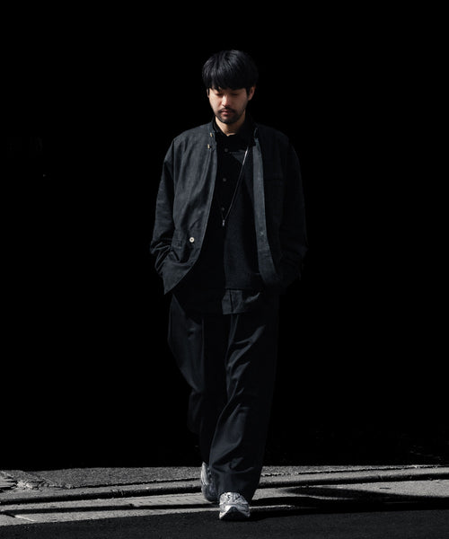 スタンドカラーとテーラーカラーを融合させたような曖昧なデザインが特徴のジャケット。