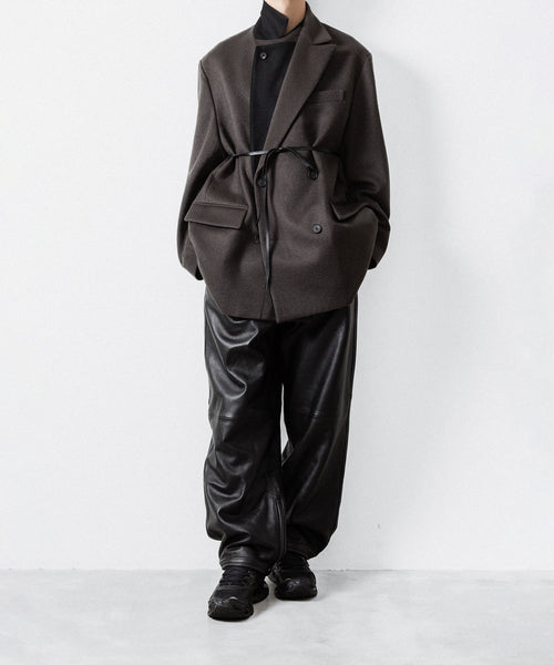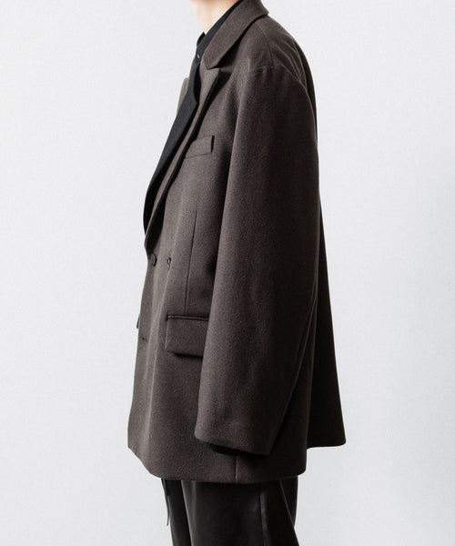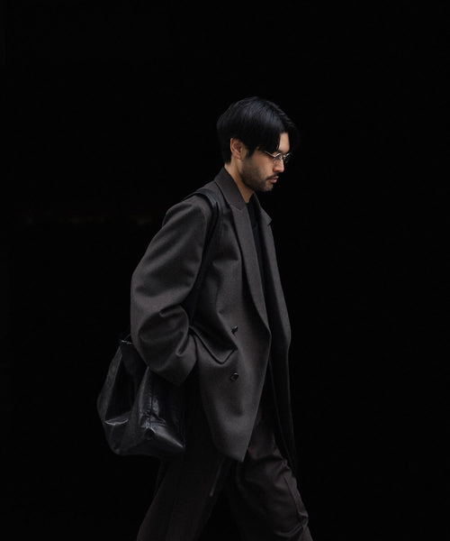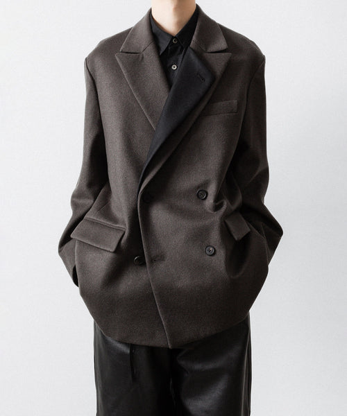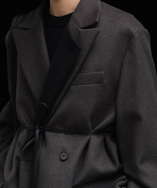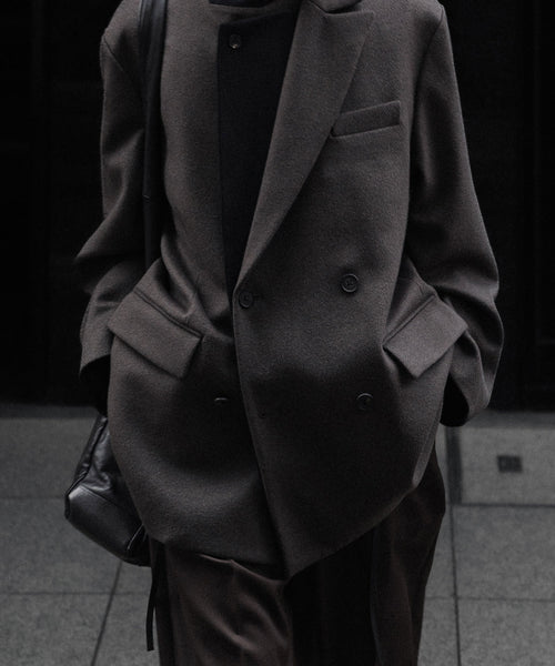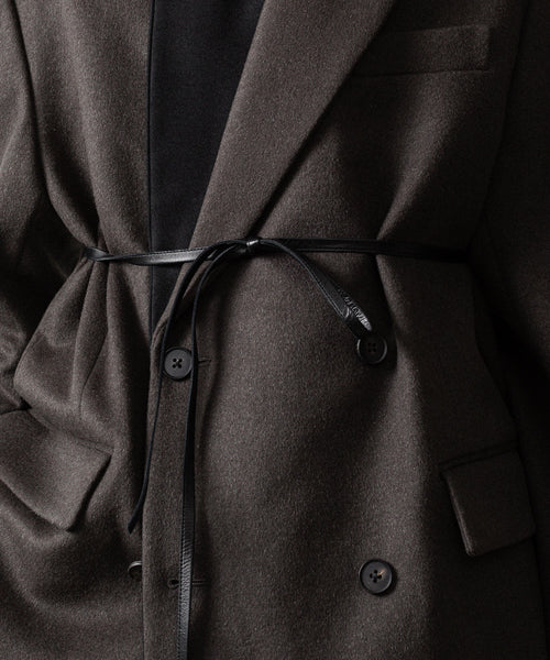 柔らかく膨らみのある生地の表面感が美しいウールカシミヤビーバーを使用した、二重に重なったラペルが特徴のダブルブレストジャケット。内側ラペルを立てたときの印象が特徴的。ウエストにはレザー紐が縫い込まれている。