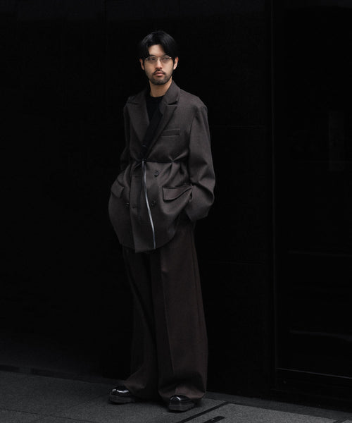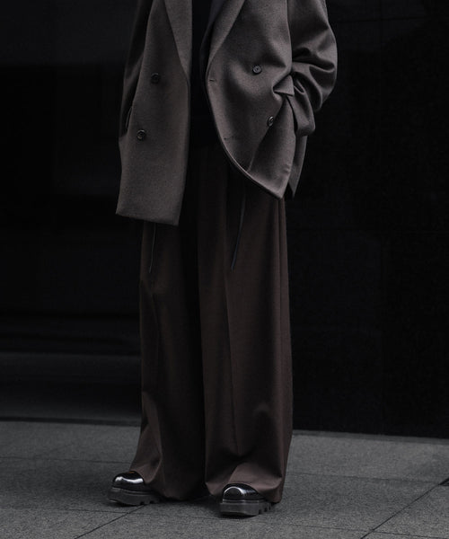 わたり幅から裾幅までスーパーワイドに設定した深めのワンタックトラウザーズ。腰回りはすっきりとしたフィット感になるよう調整し、ワイドなシルエットながら上品なエレガントなバランスに仕上がっている。