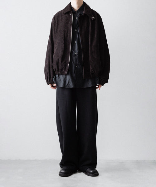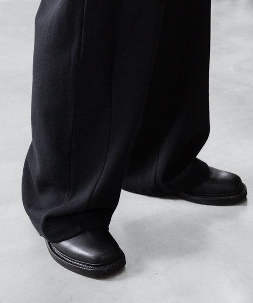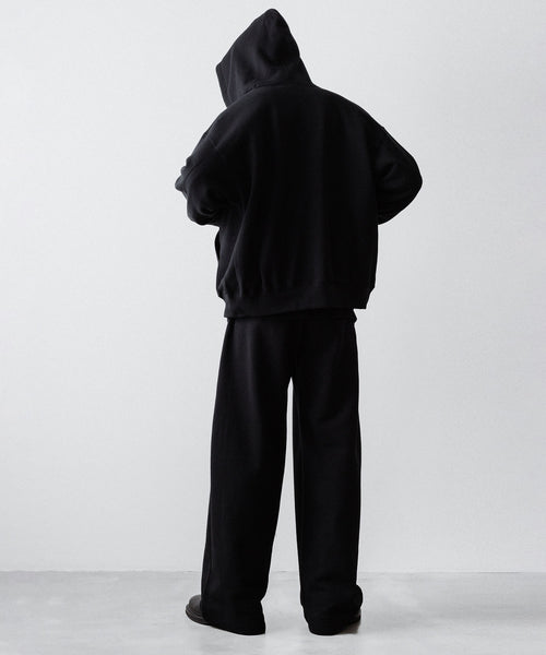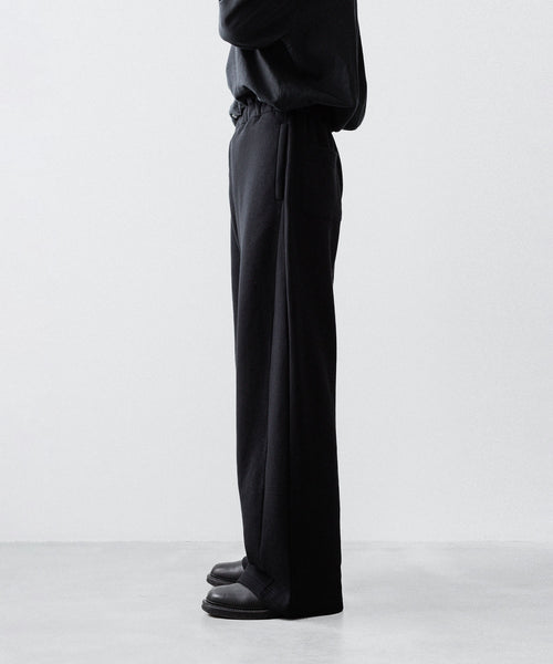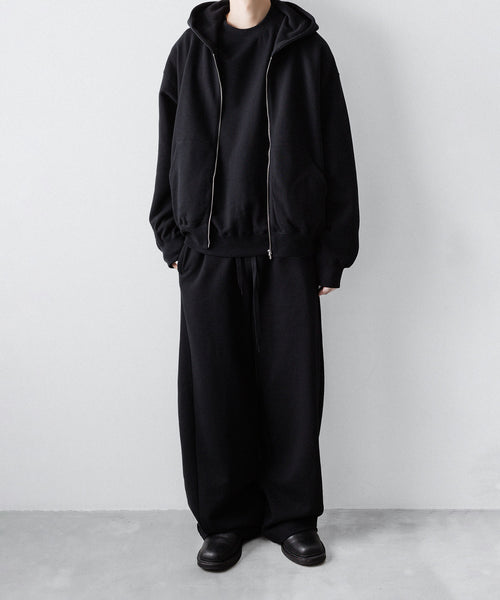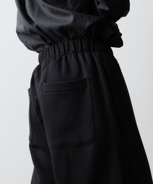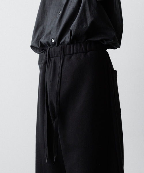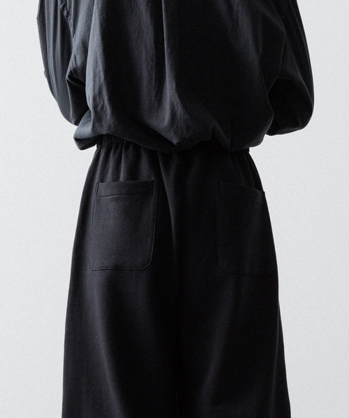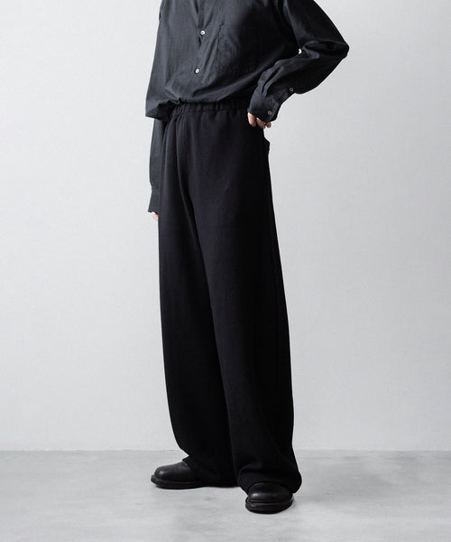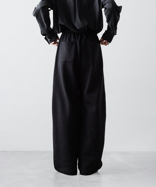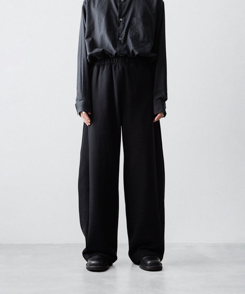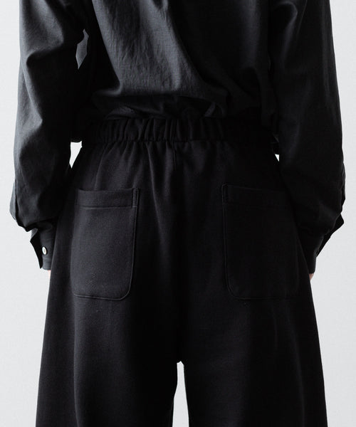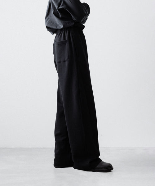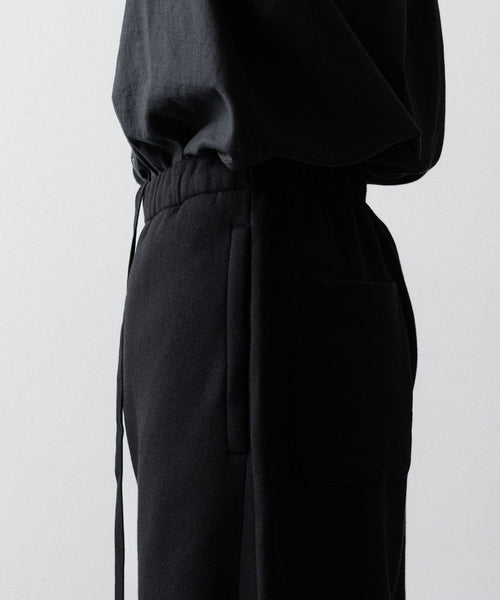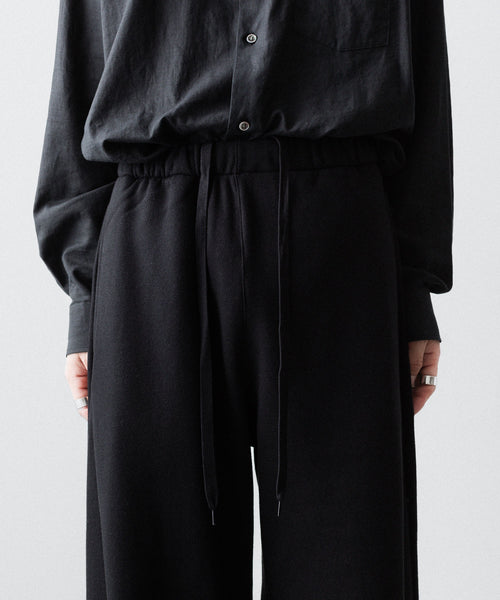 ヤク特有の柔らかさと暖かさを活かした贅沢な質感と洗練された風合いが特徴のスウェット地で製作したイージートラウザーズ。裏面を起毛することで、より一層軽くふんわりとした印象に仕上げている。脇線をツイスト気味に設定しサイドにマチをつけることでシルエットにニュアンスを出している。