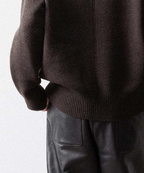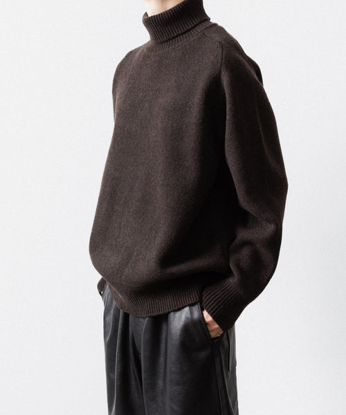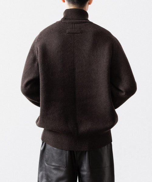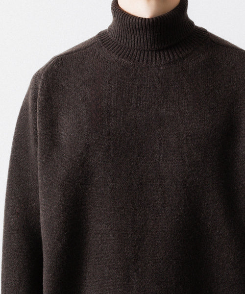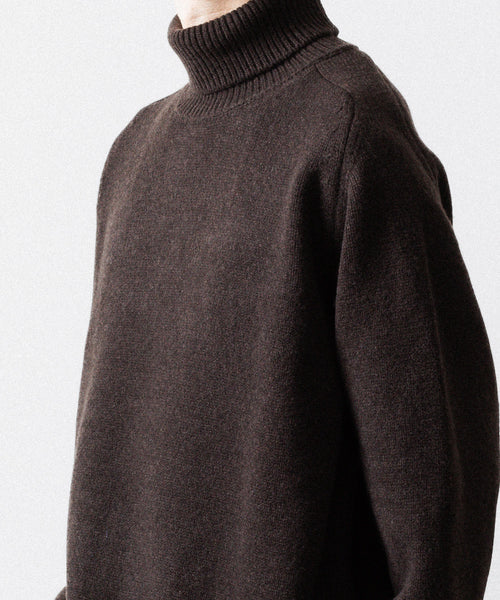 19.0μのSUPER FINE LAMBS WOOLを使用した5ゲージ3本取りのタートルネックセーター。度詰め気味に編み、軽く縮絨をかけることで美しい目面を残したまま適度な膨らみ、弾力のある表面感を実現。風合いだしの仕上げ方法にもこだわり、とても上質な風合いに仕上げている。