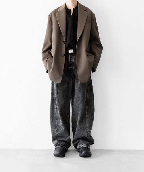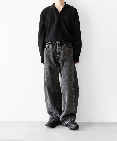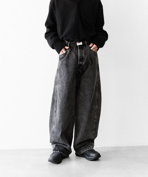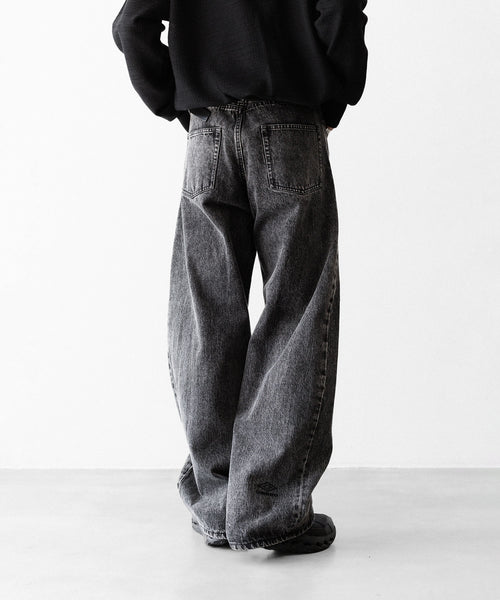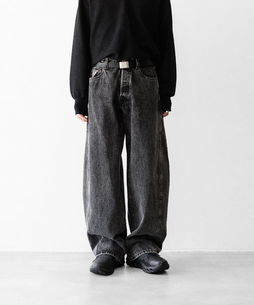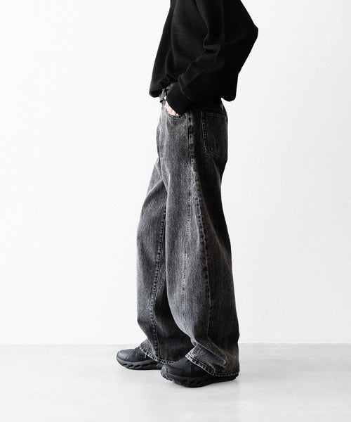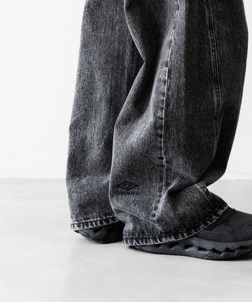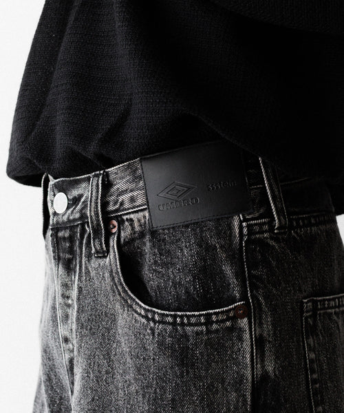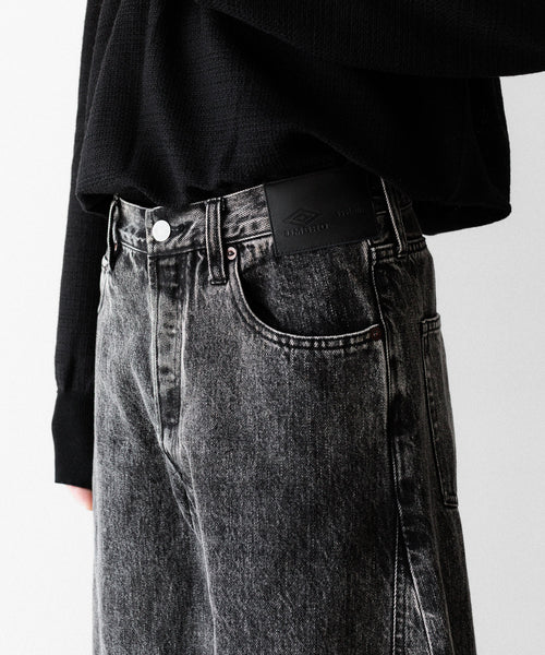 両脇はぎ部分に長めのマチをとり、太もも部分から広がり裾まで落ちるシルエットが特徴的なワイドデニム。生地は13ozの特濃ロープ染色で染めた糸を使用し、旧式力織機でゆっくりと時間をかけて織られたヴィンテージデニム生地を使用。タテ糸のムラ糸はシャープな形状で、エイジングによりリアルな糸落ち感が出るのも特徴。 ウエストフロント部分にはレザーパッチ、右足裾後ろ部分にはUMBROのロゴが入る。