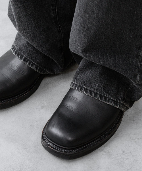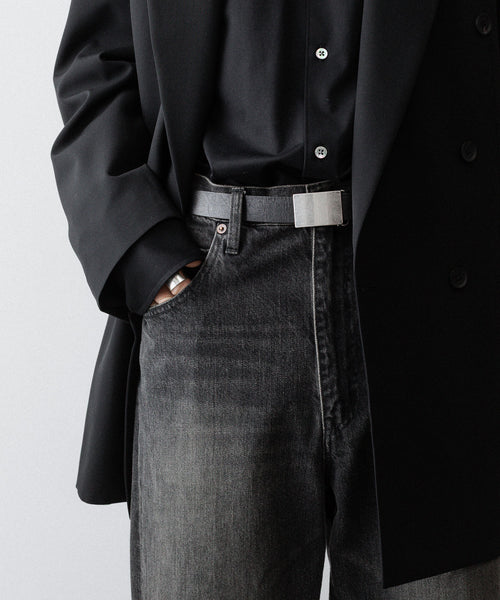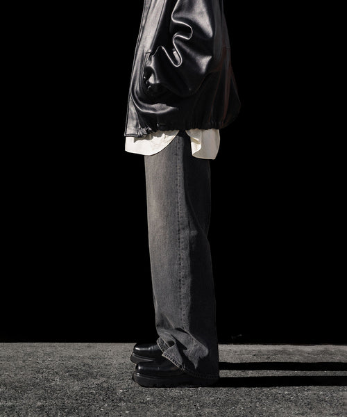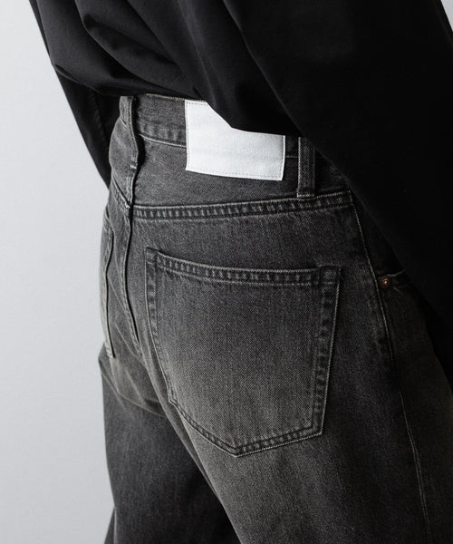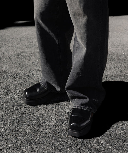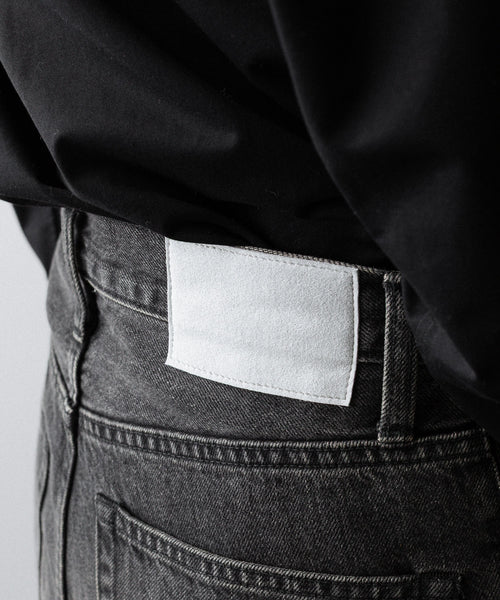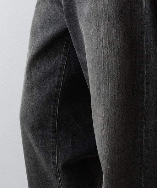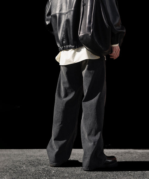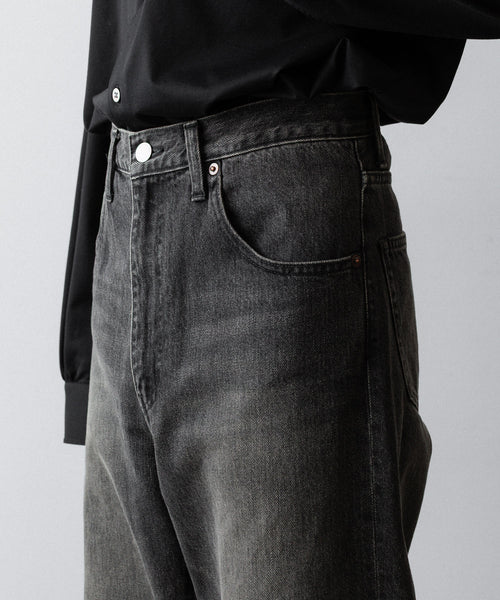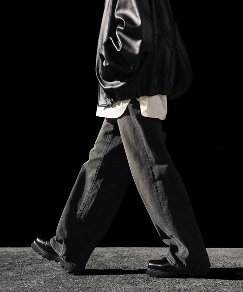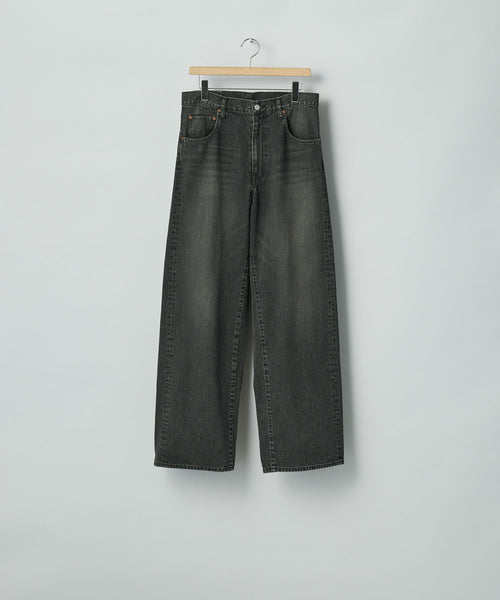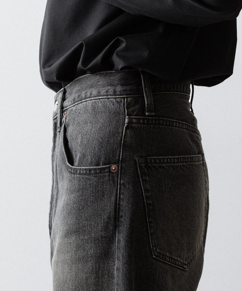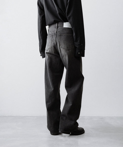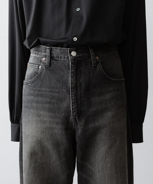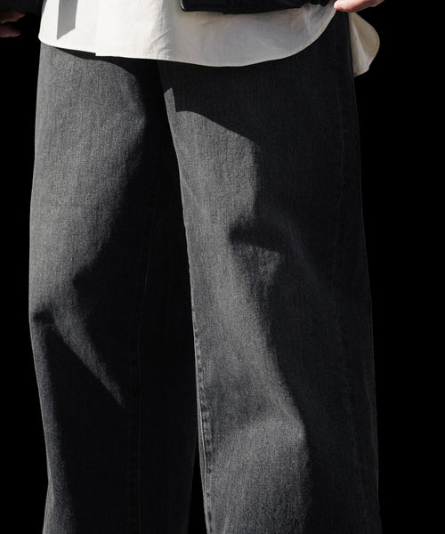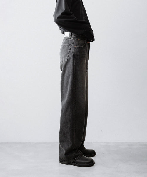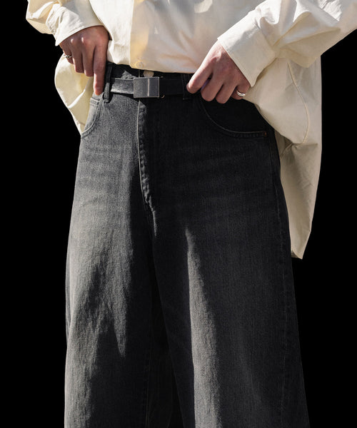 深めの股上に対し、ウエスト周りをすっきりめに設定し、太めのわたりに対して上品な印象のシルエットが特徴のワイドデニム。 様々な加工を施し、奥行きのあるデニムの表情に仕上げている。
