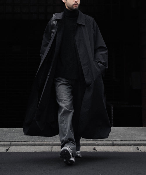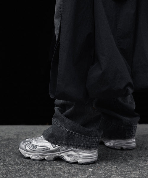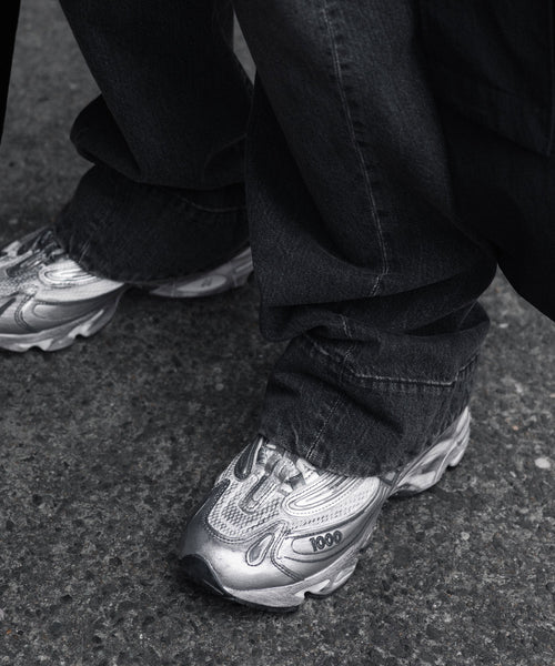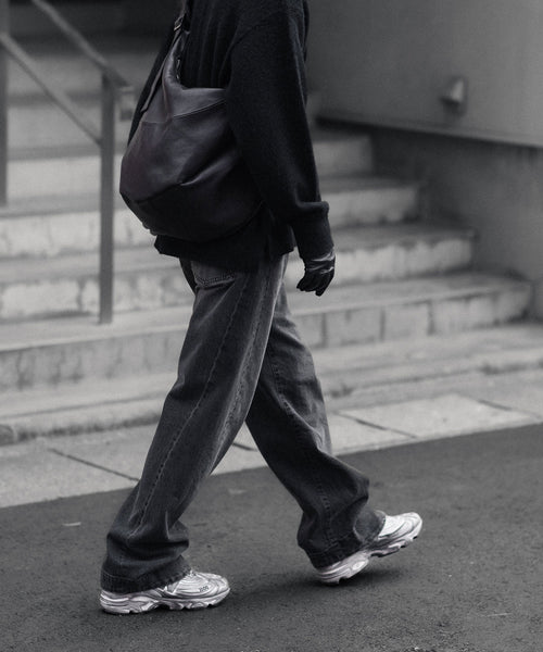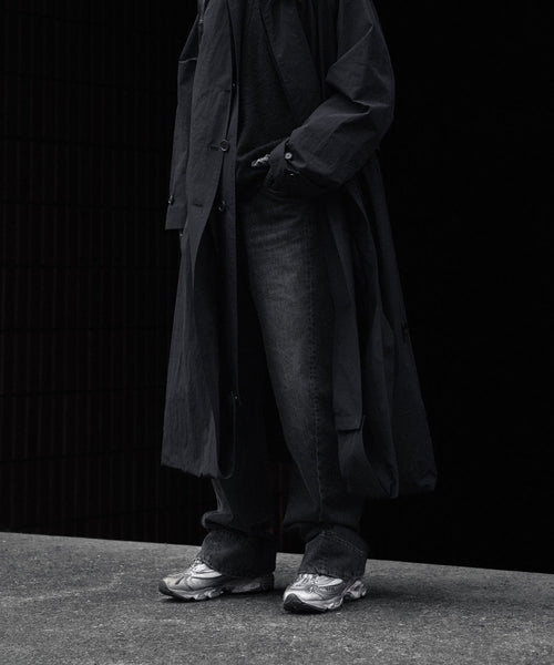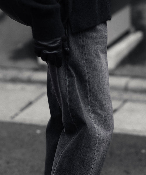 膝周りのツイストがかったシルエット、裾部分のたまり方が特徴のツイストカットデニム。 両脇、内側はぎ部分をツイスト気味にパターンを設定し、膝周りにニュアンスを出している。裾部分は前後差、左右差をつけ独特のたまり感に設定している。 ストーンウォッシュ、ブリーチ、オーバーダイ、吹付け、手作業によるダメージ感等様々な加工過程を施し奥行きのあるデニムの表情を出している。