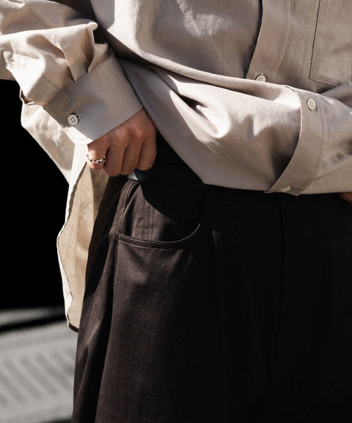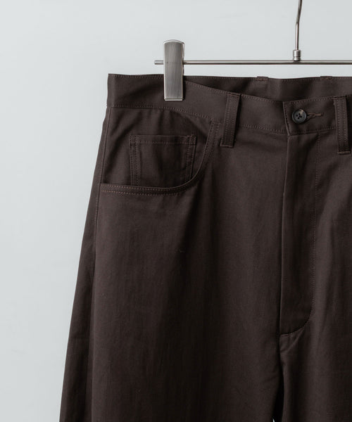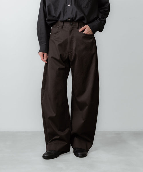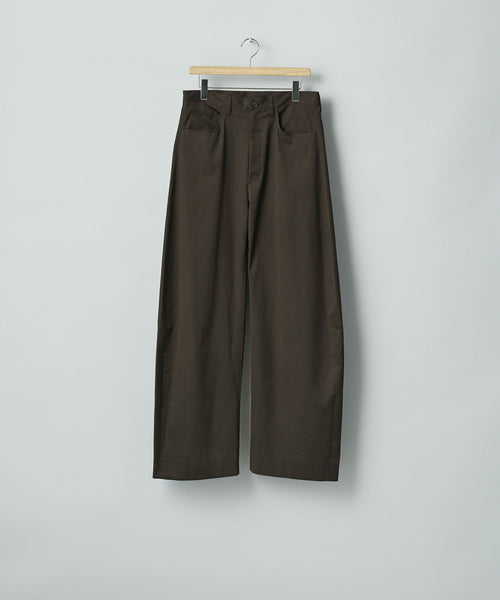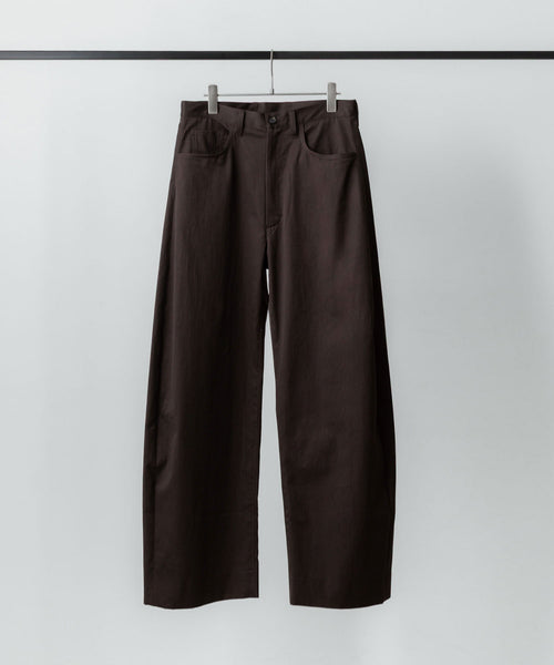 すっきりめに設定したウエストから両脇はぎ部分をラウンドするように設定した5ポケットコットンパンツ。 ラウンドした特有のシルエットでありながら、上品なバランスになるようシルエットを調整。 格別になめらかなタッチと美しい生地の表情も魅力。