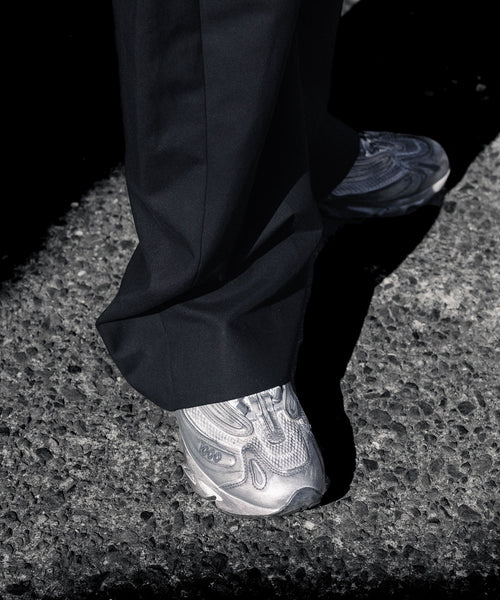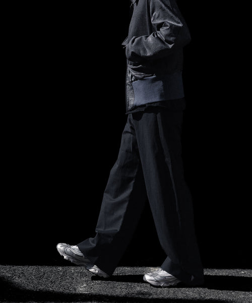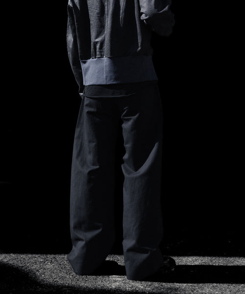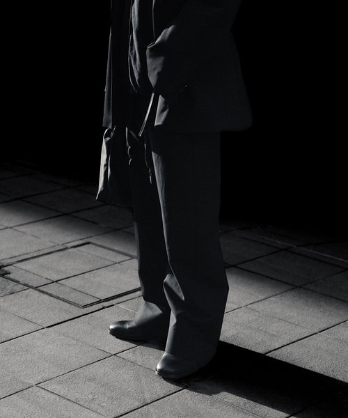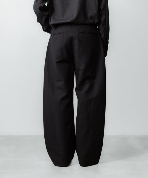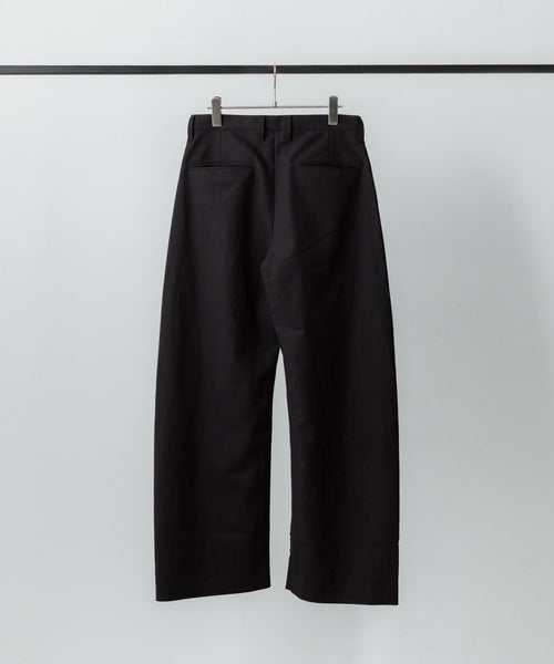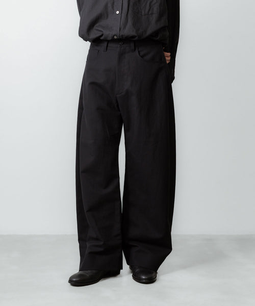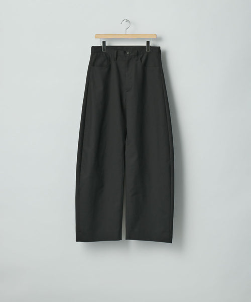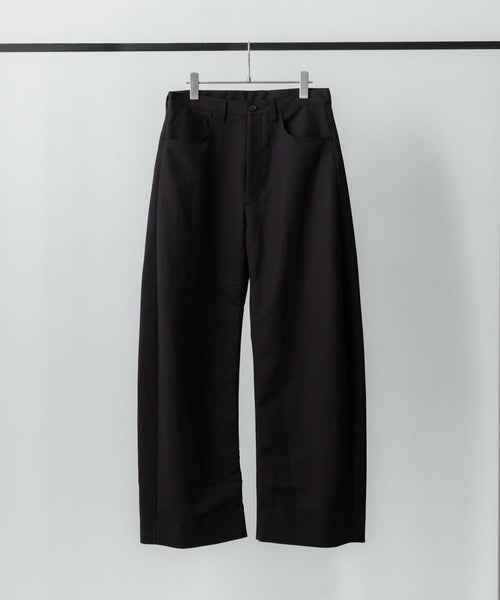 すっきりめに設定したウエストから両脇はぎ部分をラウンドするように設定した5ポケットコットンパンツ。 ラウンドした特有のシルエットでありながら、上品なバランスになるようシルエットを調整。 40/1の平二重織生地に特殊加工を施した、美しい生地の表情も魅力。