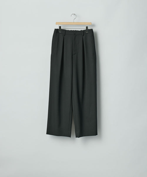インタック、アウトタック双方のタックをとったイージーワイドトラウザーズ。 イージー仕様のため、様々なウエスト位置でジャストで着用可能。 ゆったりとしたワイドテーパード気味のシルエットで、様々なトップスと合わせやすいイージート ラウザーズ。