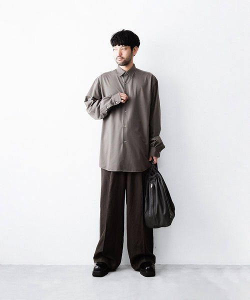 わたり幅から裾幅までワイドに設定したツータックイージートラウザーズ。 イージー仕様のため、様々なウエスト位置でジャストで着用可能。 イージー仕様ながら腰回りはすっきりとしたフィット感になるよう調整し、上品でエレガントな印象に仕上げている。