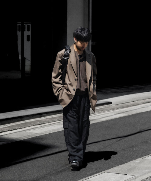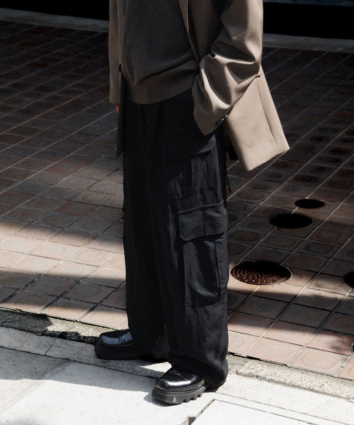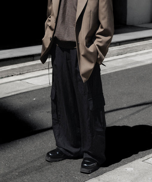 両サイドにカーゴポケットを施したイージートラウザーズ。 両脇線をやや内側にツイストさせ、全体のシルエットにニュアンスを。 イージー仕様のため様々なウエスト位置でジャストで着用可能。