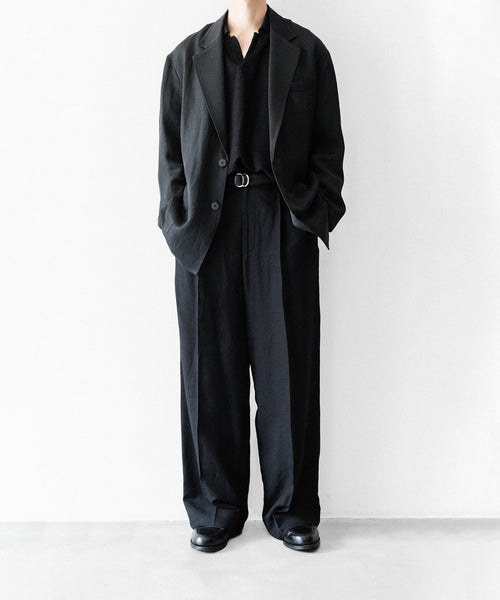 経糸にヴィスコースレーヨン、緯糸にリネンを使用したツイル生地で製作した一重仕様のシングルブレステッドジャケット。 軽い着心地だけでなく、ジャケットの印象が残るよう肩周りの仕様、ラペル、着丈、袖丈を設定。 タンブラーワッシャー加工による生地のニュアンスのある表情が特徴。