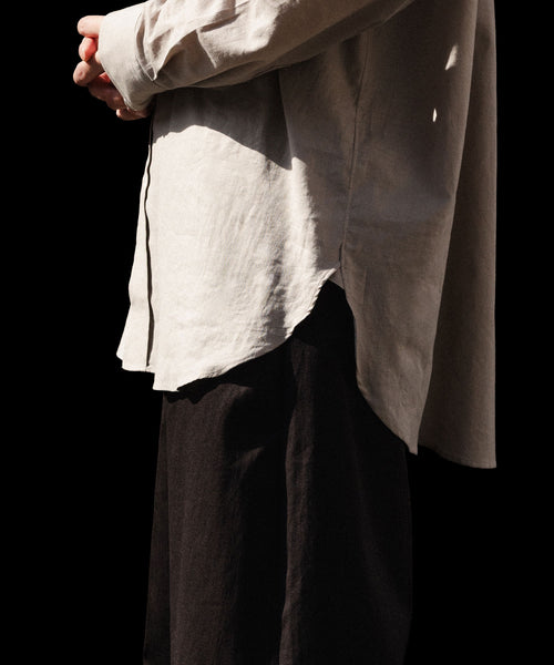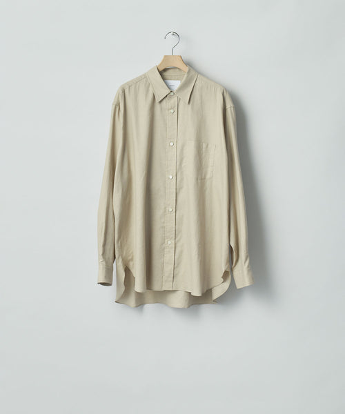 タテ糸が100番単糸コットン×ヨコ糸が60番単糸のコットン/シルクの混紡糸を使用したプラケットフロントのレギュラカラーシャツ。 タテ×ヨコ単糸の為、製織にも時間が有するとても貴重で繊細な素材で、仕上げのタタキ加工で非常に柔らかな風合いに仕上げている。シルク混による上品な微光沢感も特徴。