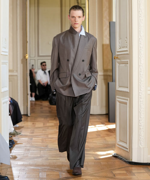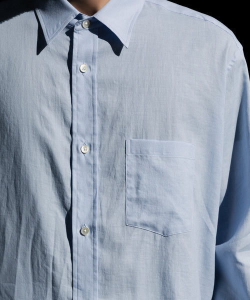 タテ糸が100番単糸コットン×ヨコ糸が60番単糸のコットン/シルクの混紡糸を使用したプラケットフロントのレギュラカラーシャツ。 タテ×ヨコ単糸の為、製織にも時間が有するとても貴重で繊細な素材で、仕上げのタタキ加工で非常に柔らかな風合いに仕上げている。シルク混による上品な微光沢感も特徴。