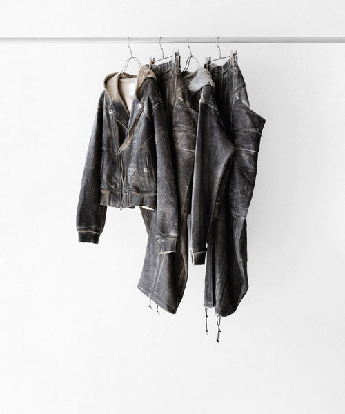 ボディとフードのつなぎ目はグラデーションでコーティングしているので、レザーのライダースが段々とスウェットに変化していくような演出となっています。