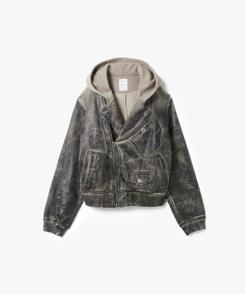 上衿をフードにすることで、ライダースジャケットの下に同素材のフーディをレイヤードしているかのようなトロンプルイユなデザインになっています。
