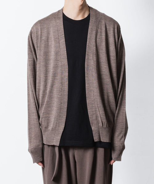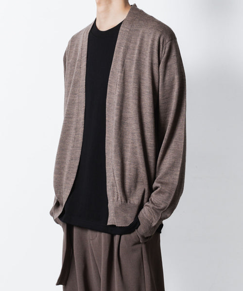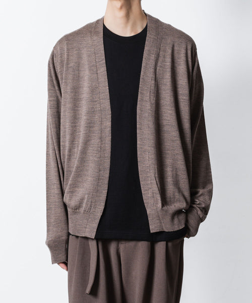 JOHN SMEDLEYの特徴的なオーセンティックなバランスを保ちながらも、肩幅や着丈、腕周りに若干の余裕を持たせたカーディガンをベースに、ATTACHMENTらしいミニマルなデザインへ。