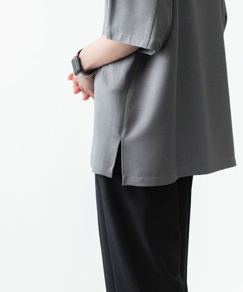 身体を包み込むような柔らかなフォルムと、空気をはらむ軽やかなシルエットが、盛夏においても涼やかな印象を演出。裾のサイドスリットが動きにさりげないニュアンスを加え、ミニマルな中に奥行きを感じさせます。