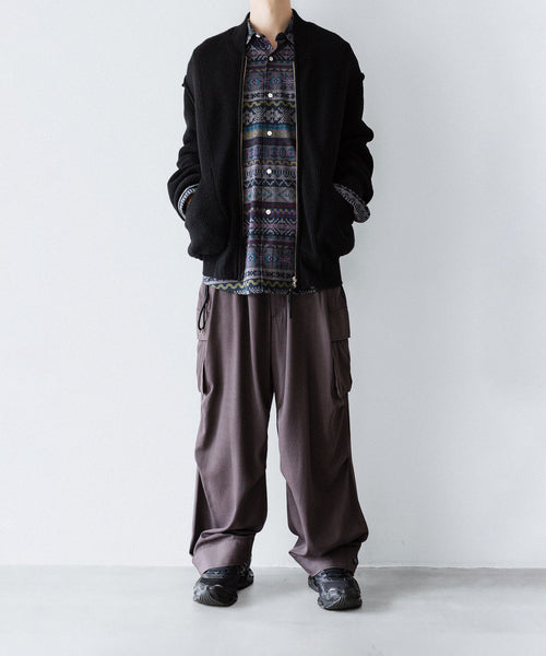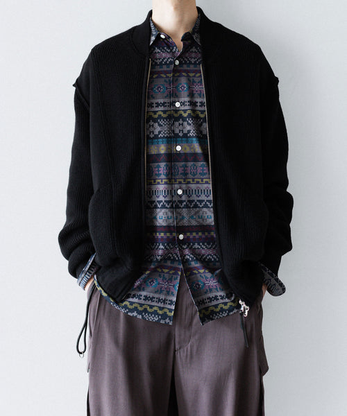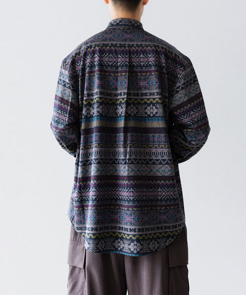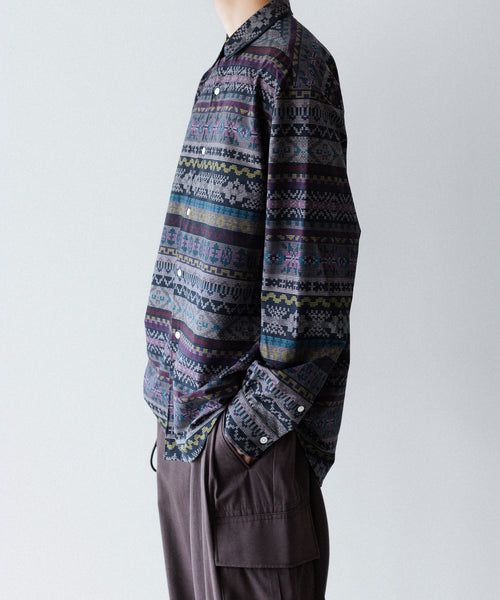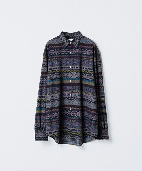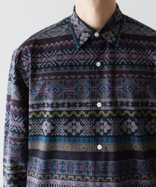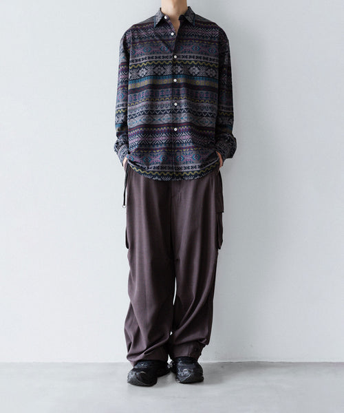ディティールは、ドレスシャツを採用し全て巻き伏せ本縫い仕様、貝蝶釦使いです。素材のハリ感、光沢感、そして塩梅の良いシルエット、生地が生み出すドレッシー感とパターンを融合させた、唯一無二のシャツ。 袖のギャザーなどよりドレスなディティールに仕上げています。