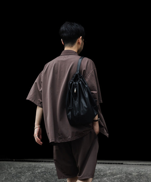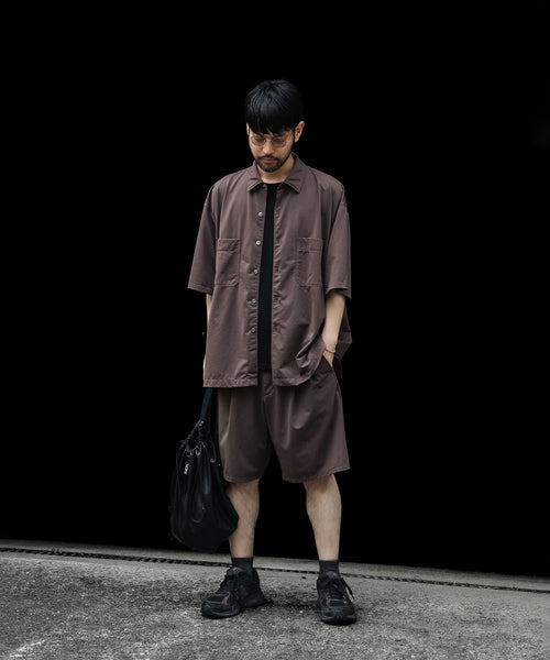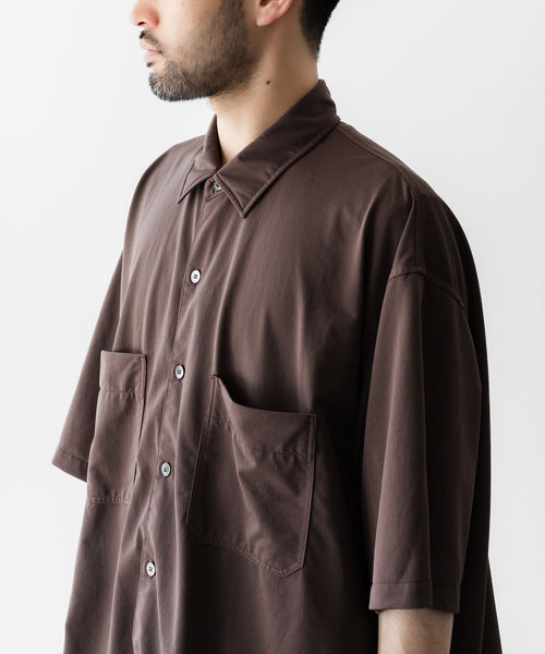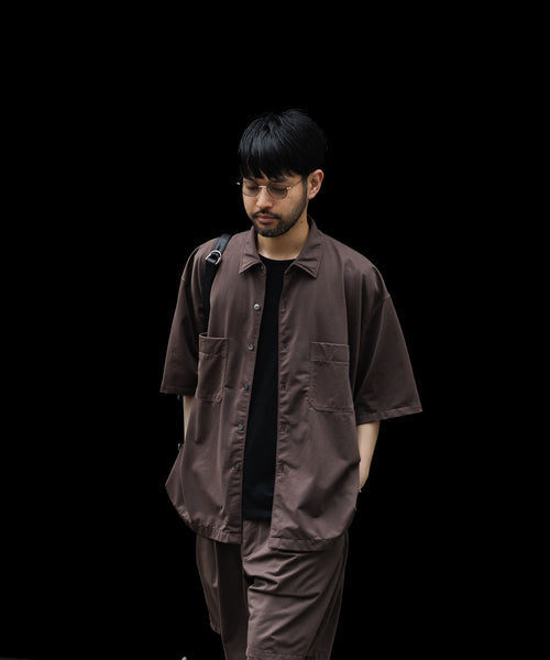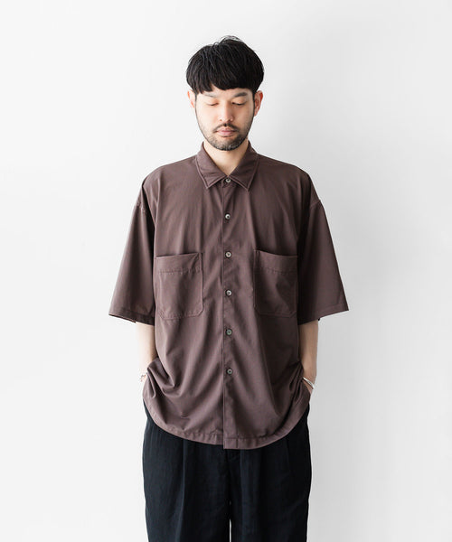標識という意味のある新型は、ワークとドレスの中間のシルエット。 完全新素材のナイロン100%ニット。暑い時期に最適な素材感。 36Gというスーパーハイゲージで、表面感のある梨地を作成。ストレッチ性が高く一度着ると止められない着心地。そして、着用時のしわなどの形態変化も少なく、イージーケア性も高い。 ハリ感、光沢感、イージーケアを持ち併せたニュースタンダード素材。ディティールは、ドレスシャツを採用し全て巻き伏せ本縫い仕様、貝蝶釦使いです。素材のハリ感、光沢感、そして塩梅の良いシルエット、生地が生み出すドレッシー感とパターンを融合させた唯一無二のシャツ。新素材のナイロンは、50D 高捲縮ナイロン糸を100%使い。表面感のある素材をすべて特殊洗いをかけることで、よりハリ感を出して作成しました。タンブラー乾燥を製品状態でかけることで、洗濯後の縮みがありません。 釦裏側にブランドロゴが入っています。