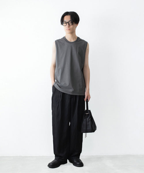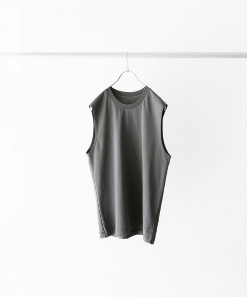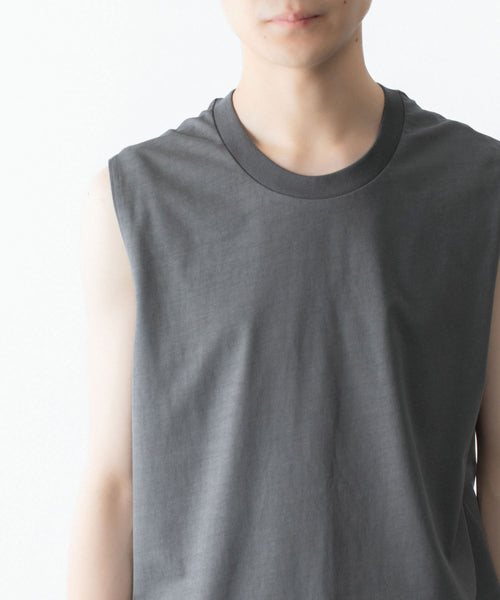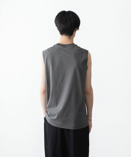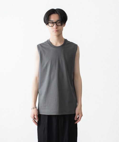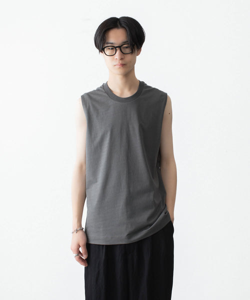 KANEMASA PHIL.独自の36G というハイゲージ編み機で、限界まで詰めた度詰め天竺組織を使用。60/1オリジナルリサイクルスビンを引き揃え、度詰めで編むことで表面の面が良く独特な雰囲気のある素材感です。