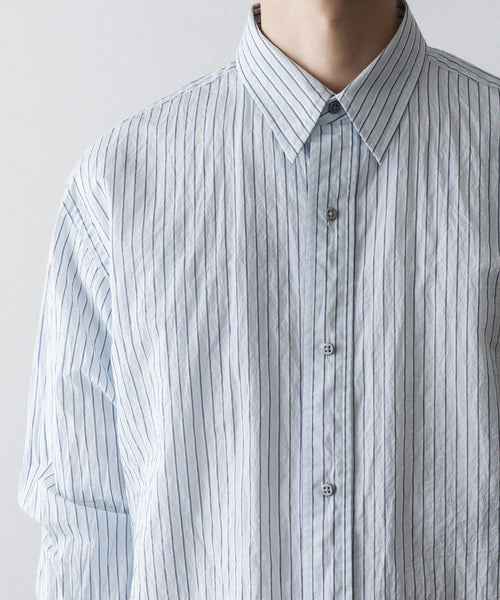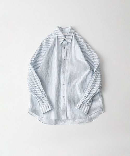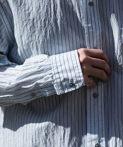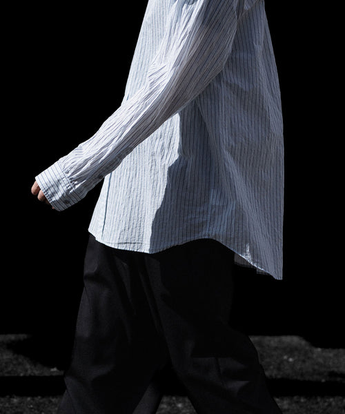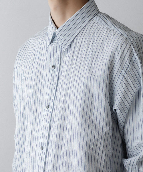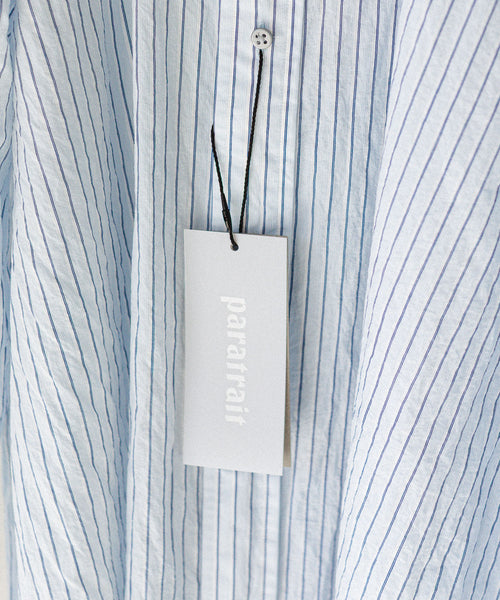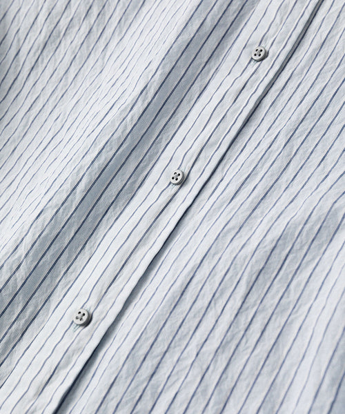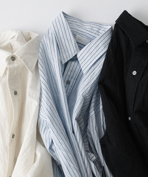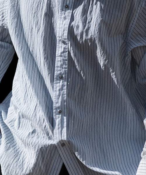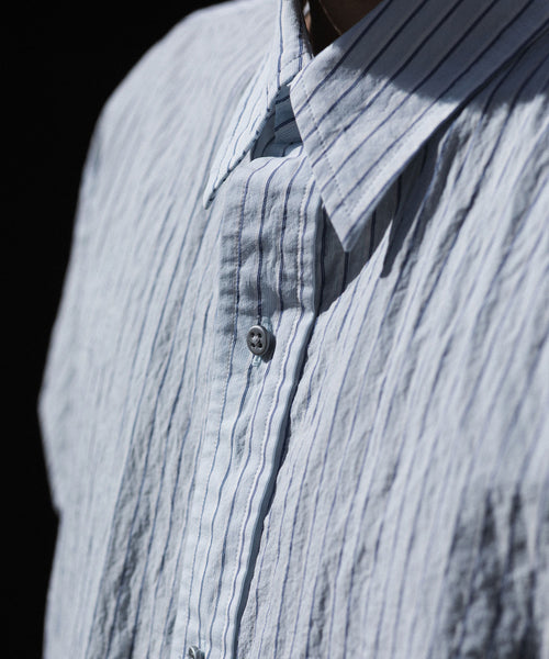 paratrait定番のフロート系のフィッシングラインに着想を得て軽さと清涼感を追求するためにモノフィラメントを縦糸に使用した特殊な素材を加工で追い込んだレギュラーカラー、前たて仕様のコットンシャツです。