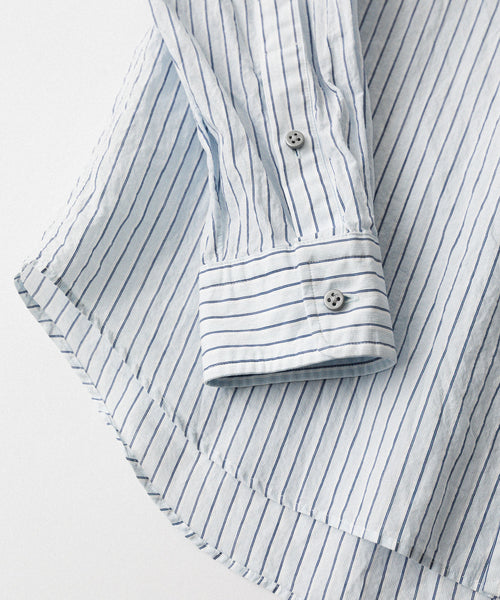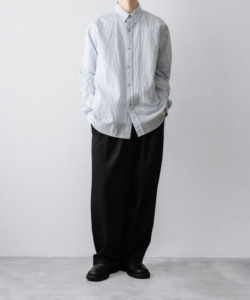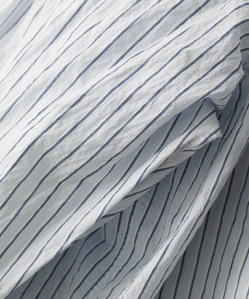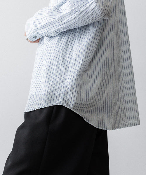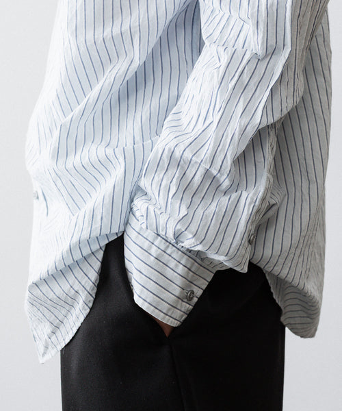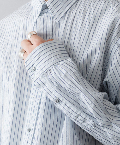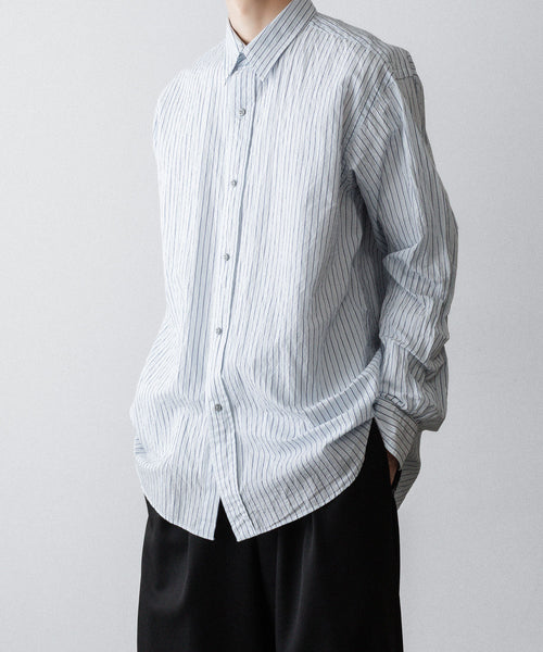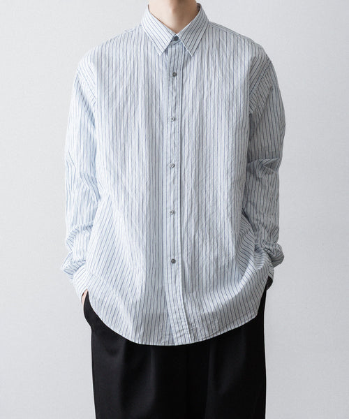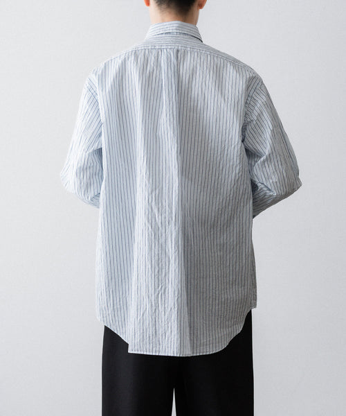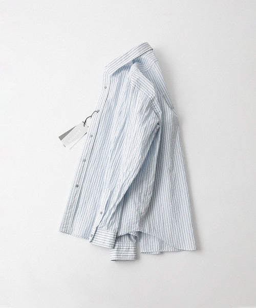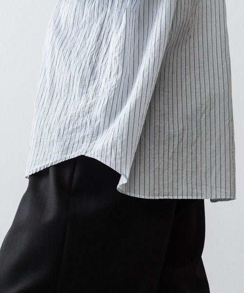 paratrait定番のフロート系のフィッシングラインに着想を得て軽さと清涼感を追求するためにモノフィラメントを縦糸に使用した特殊な素材を加工で追い込んだレギュラーカラー、前たて仕様のコットンシャツです。
