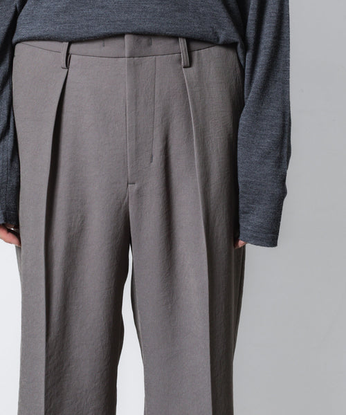 通常、外向きに入るタックを内側に向けることで、ワイドながら横への広がりを抑えすっきりとした表情に。