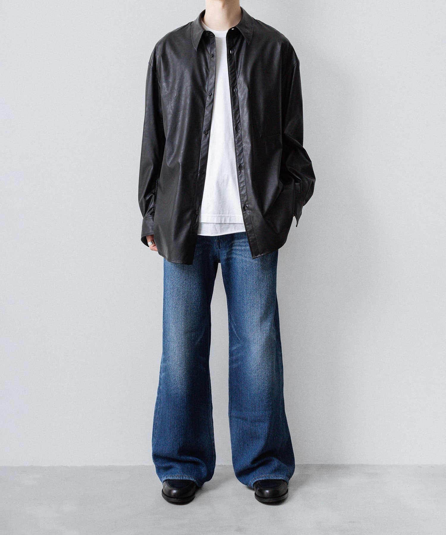 オーバーサイズにデザインしたシンセティックレザーシャツ。