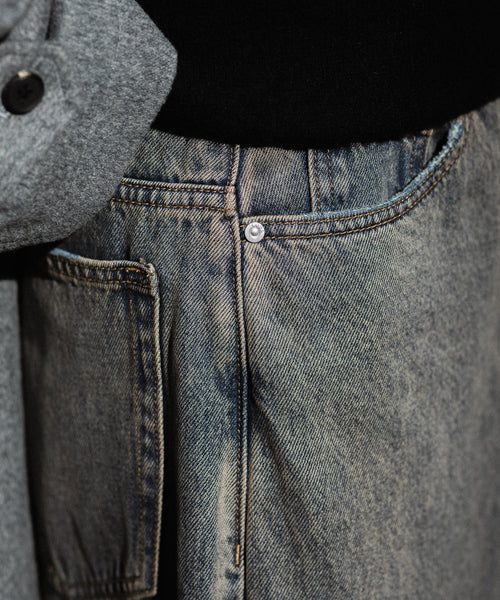 「アシッドウォッシュ」と呼ばれる特殊な酸化剤で生地を脱色する手法を用いることで、独特のムラのある表情に仕上げています。
