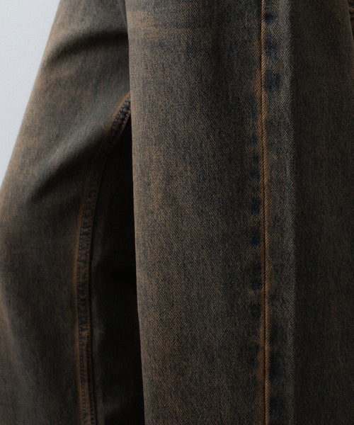 素材には、経糸にBLACK、緯糸にBROWNの糸を用いた中肉のデニム生地を使用。
