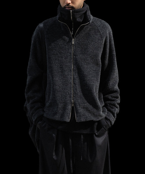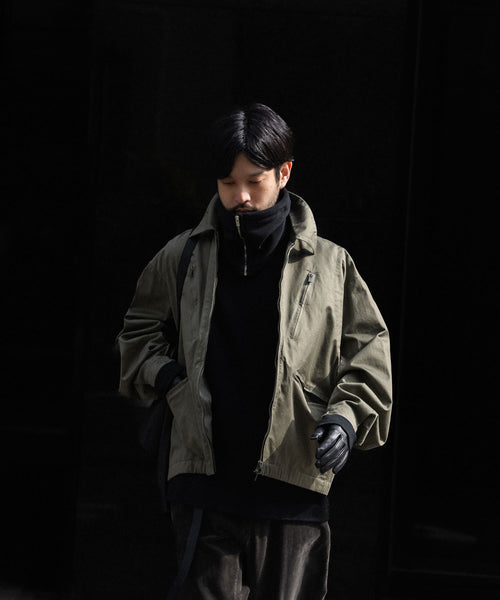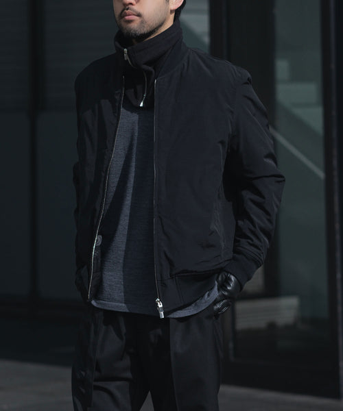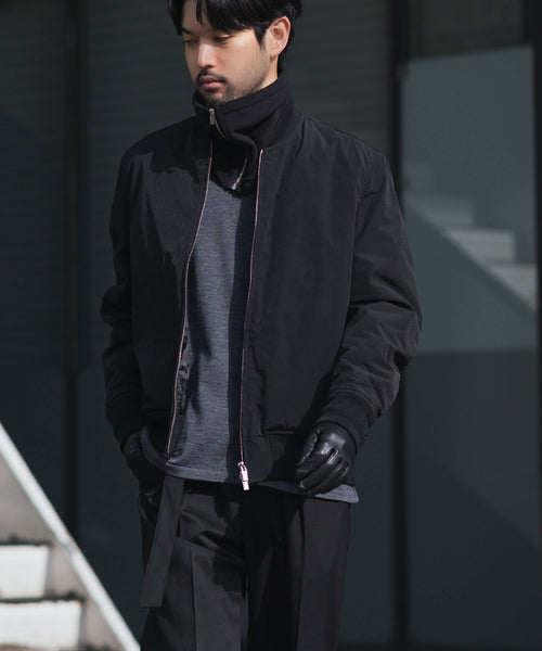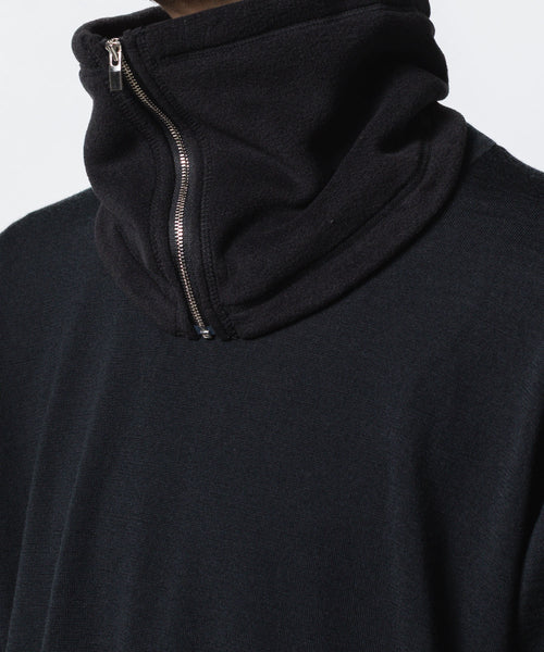 フロントのZIPが程よいアクセントとなり、まるでハイネックブルゾンを中にレイヤーしているような印象になるのも魅力。