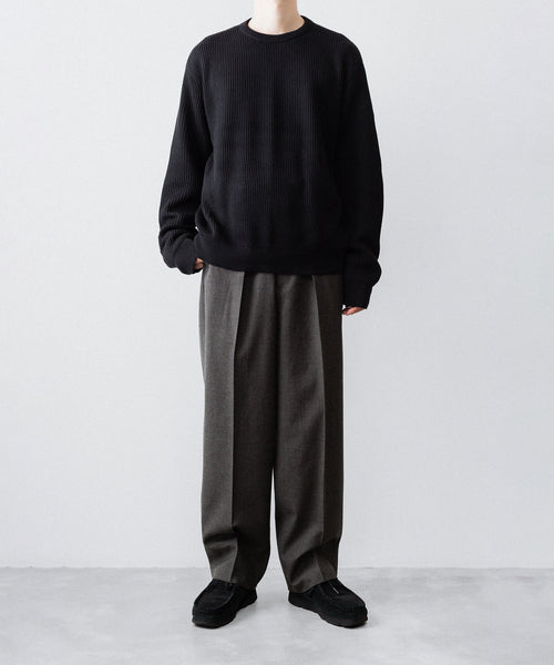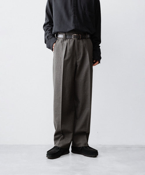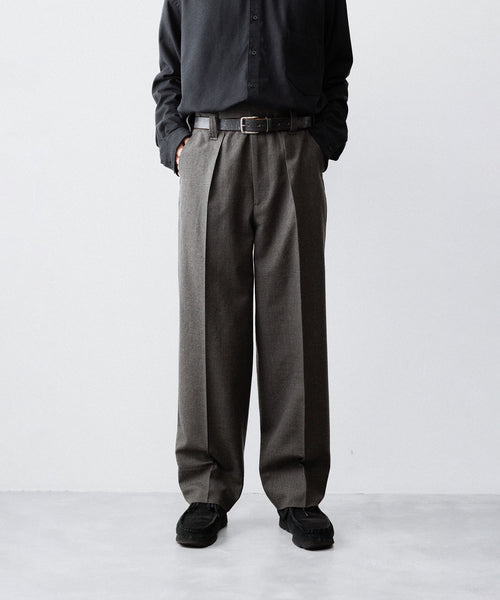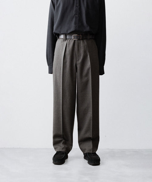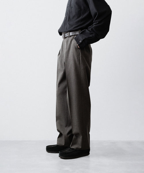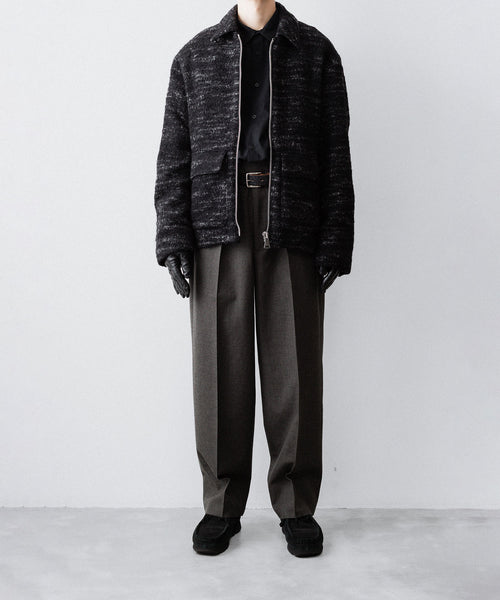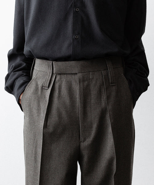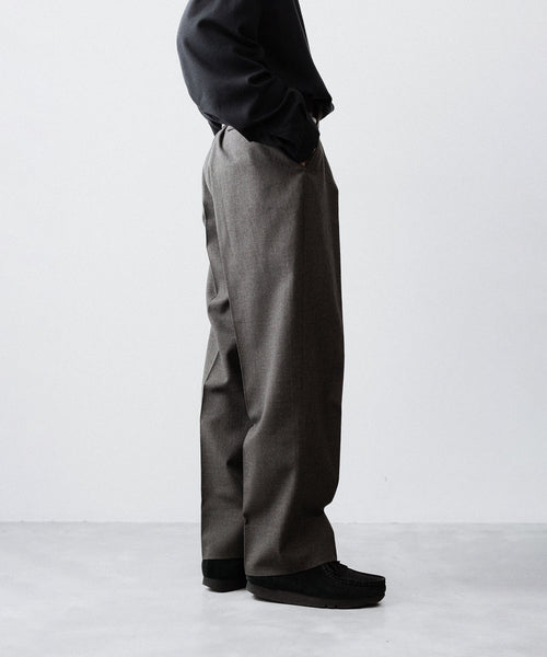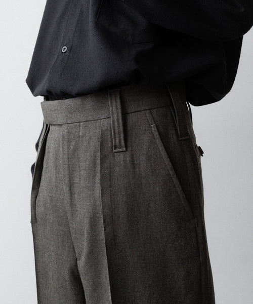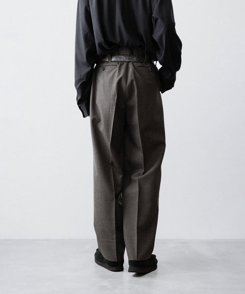 50年代フランス軍の名作のパターンにならい、股上とわたり、ヒップまわりのボリュームをやや大きめにとり、すそにかけてゆるやかにテーパードする1タックトラウザーズ。ほどよいボリューム感がありつつ、フルレングスで着用できるスラックスをイメージしています。ディテールには英国の軍士官が着用していたトラウザーズを踏襲し、太く⻑いベルトループやループ付きのバックポケットを採用。前立てには Lampo社のクラシックなスリムファスナーを採用しました。ブランドロゴ入りのオリジナルマーベルト仕様です。