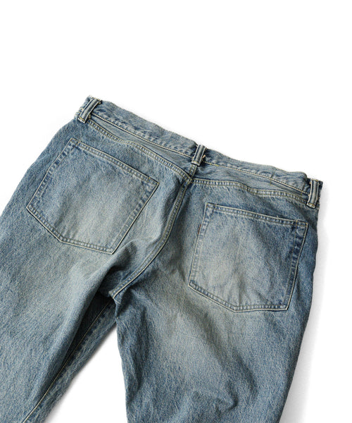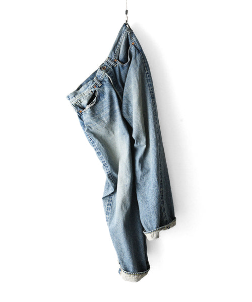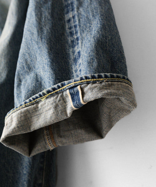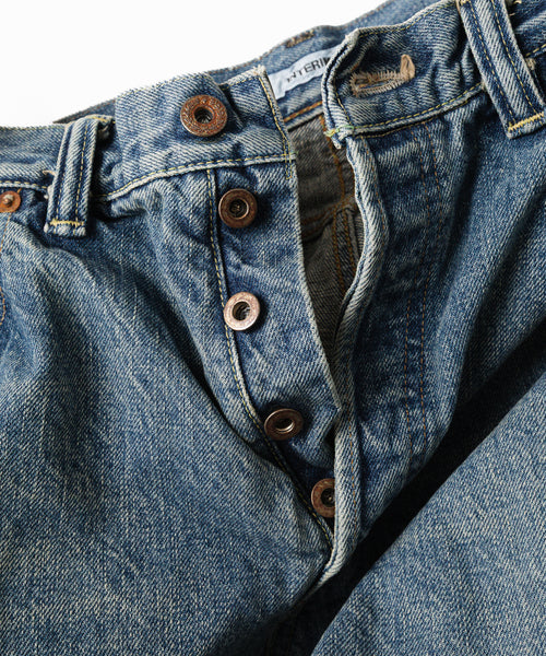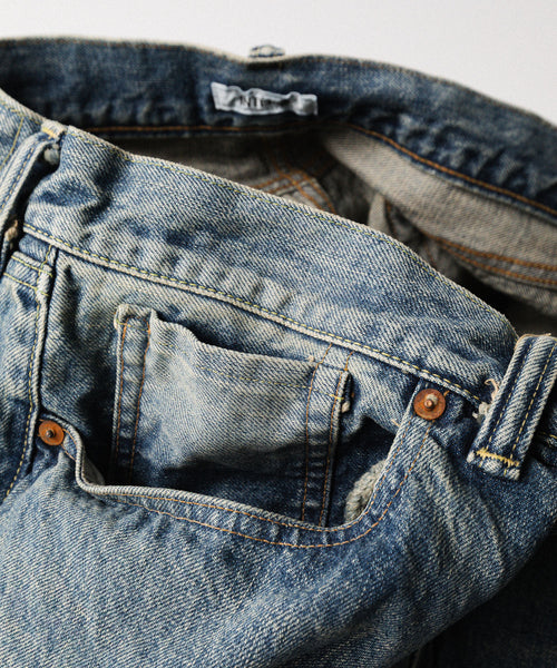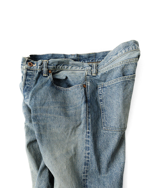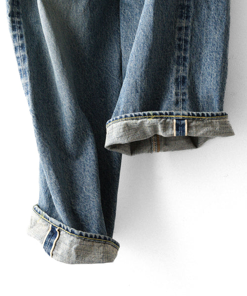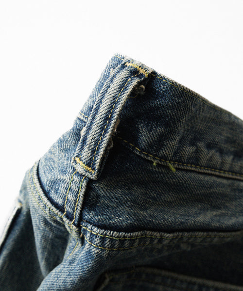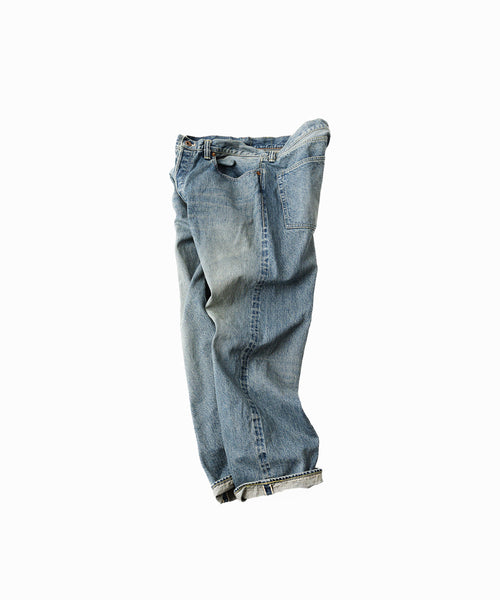 ヴィンテージの名作・大戦ジーンズをモチーフに、ハイパービッグサイズで再構築した一本。大戦モデルのフォルムを踏襲しつつ、ウエストはベルトで絞る前提のワイドシルエットに。丈はロールアップや裾上げを想定した⻑めの設定。体型を問わず、たっぷりとしたシルエットで着用できるデザインです。生地はヘビーオンスの生機デニムを使用。前立ては鉄製の月桂樹ボタンとドーナツボタンによるボタンフライ。隠しリベット付きのバックポケットやイエロー系のステッチ、アソートのスレキなど、時代考証に基づくディテールを盛り込んでいます。